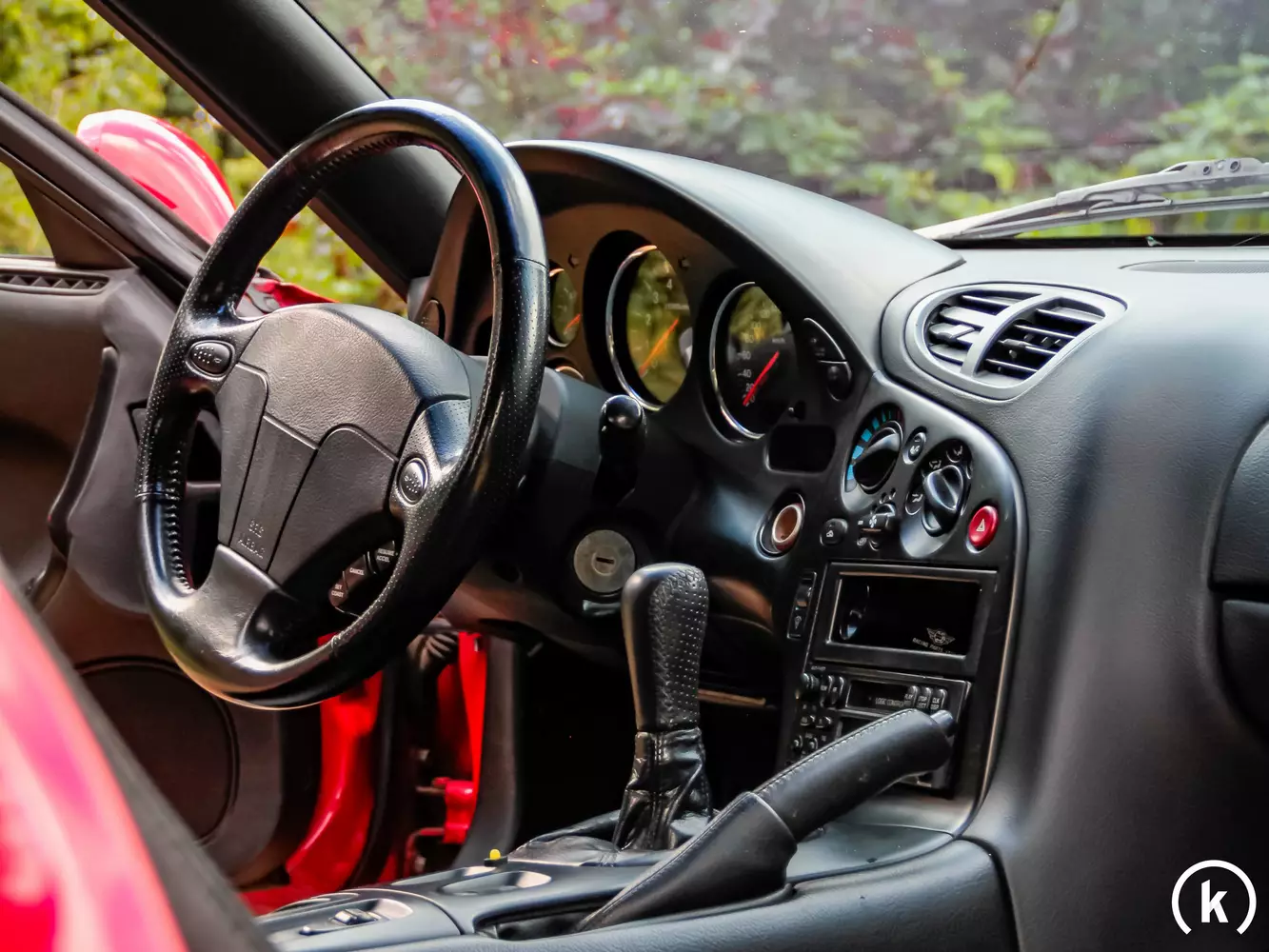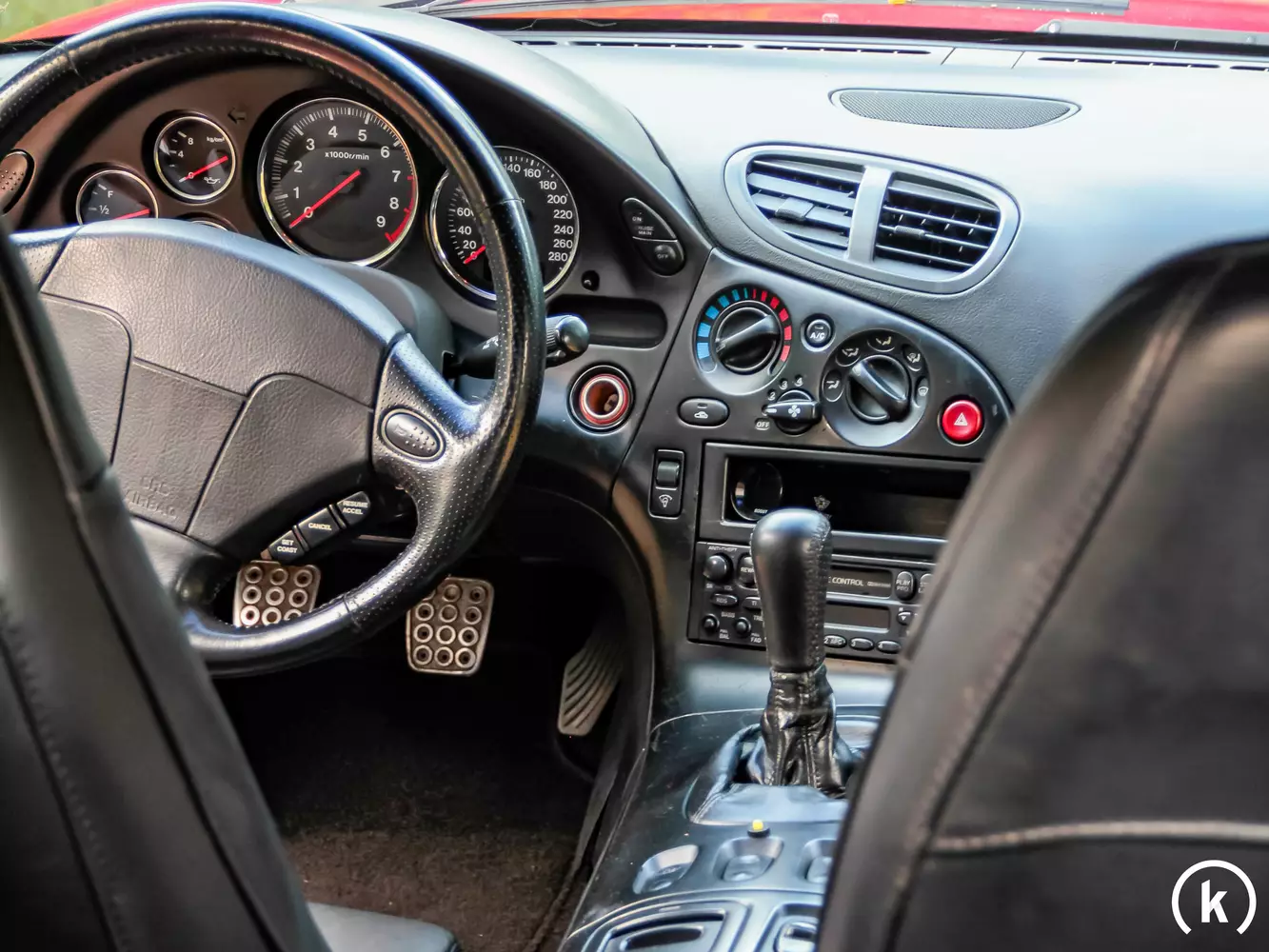 Beide Vordersitze bekamen im Lauf der Zeit ein neues Leder übergezogen, deshalb befinden sich diese in einer sehr guten Verfassung. Zudem kann dem gesamten Interieur eine gute sowie gepflegte Verfassung entnommen werden, da sich bis auf minimale Gebrauchsspuren und kleinen Kratzern keine Beschädigungen im Innenraum dieses RX-7 FD befinden. Neben einem Schiebedach, einer Servolenkung, Zentralverriegelung und elektrischen Fensterhebern sind als Ausstattungsmerkmale zudem eine Klimaanlage sowie ABS, Tempomat und ein Original-Kassettenradio zu nennen. Bis einen laut jetzigen Halter manchmal aussetzenden Drehzahlmesser funktionieren alle Schalter, Hebel, Instrumente und Anzeigen im Inneren des Mazda problemlos.