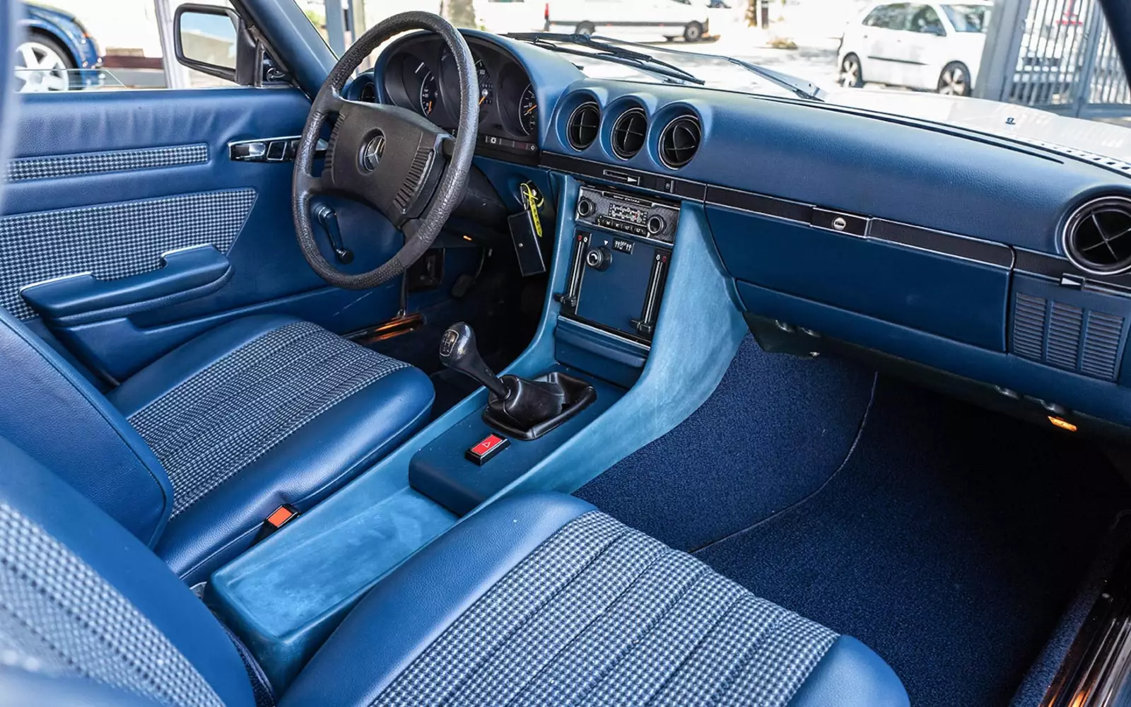 Pepita Muster mit blauem Teilleder Interieur im weißen SL… Ich wünschte so stilvoll könnte man heutzutage neue Autos kaufen!