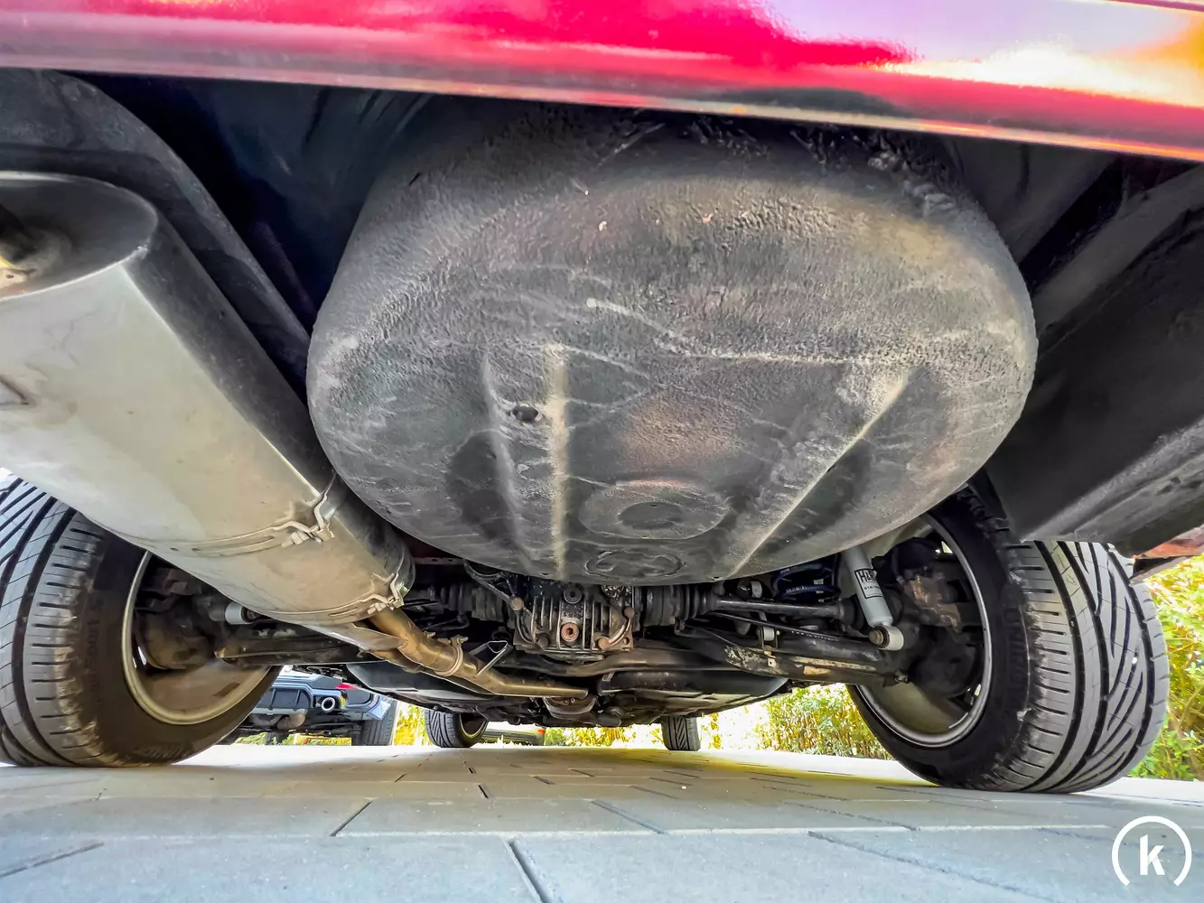 Lacktechnisch präsentiert sich dieser im Farbton „Calypsorot-Metallic“ gehaltene 325i in einem recht ordentlichen Zustand. Laut Verkäuferangaben fand im Jahr 2008 in Deutschland eine Komplettlackierung statt – bei welcher der Lack auf der gesamten Karosserie erneuert wurde. Als momentane Mängel gibt der jetzige Halter folgende Auffälligkeiten an: Kratzer, kleinere Abnutzungsspuren und am Kofferraumdeckel befindet sich ein circa 3-4 cm großer oberflächlicher Lackschaden. Einen Unfallschaden kann der Verkäufer im jetzigen Besitz ausschließen. Auffallend am Heck dieses E30 sind die abgedunkelten Heckleuchten und die 2 Endrohre des Eisenmann Endschalldämpfers.