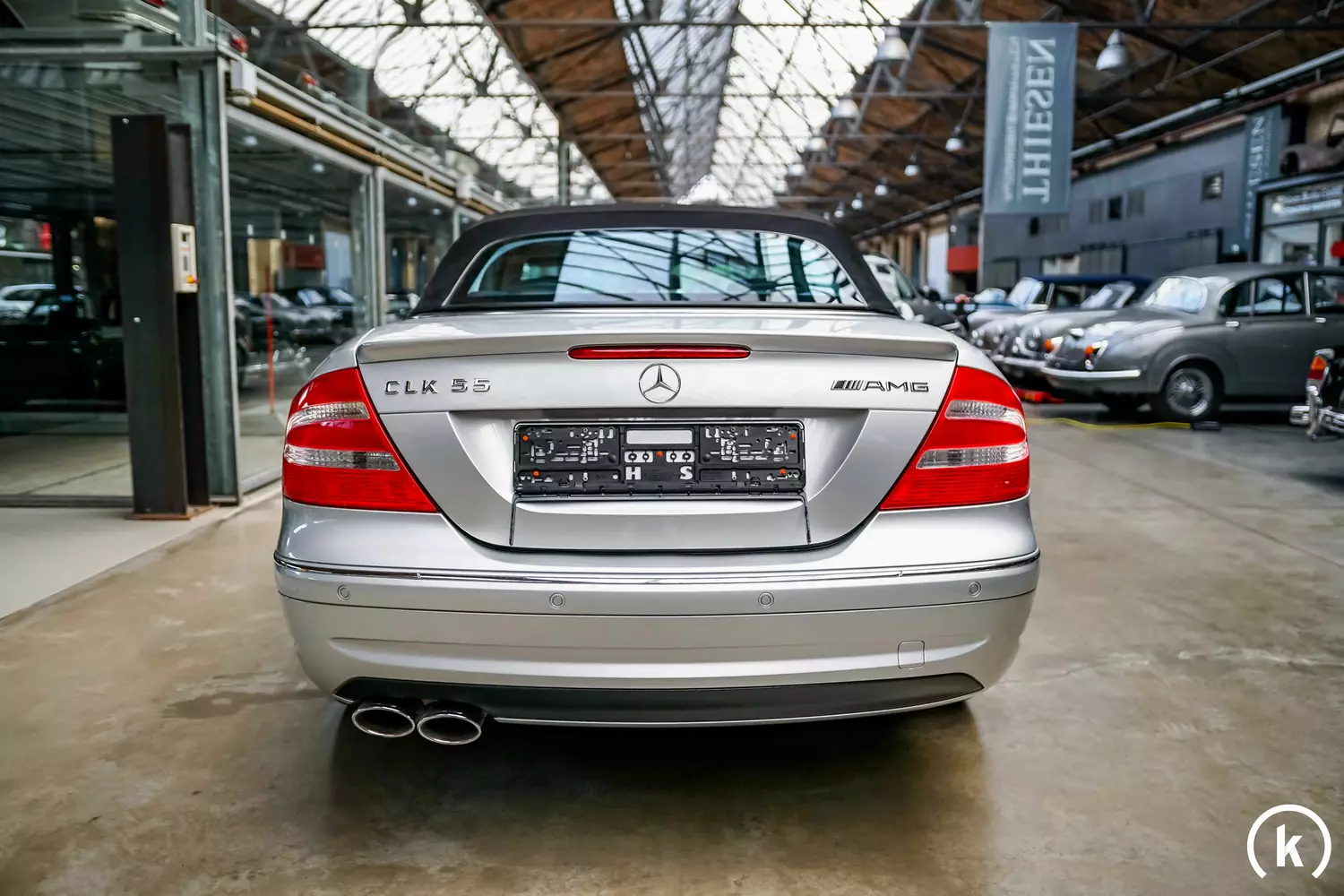 Äußerlich präsentiert sich der Mercedes-Benz in einer äußerst guten Verfassung, der Name des Lacks lautet „Brillantsilber-Metallic“ (Farbcode 744). Farbunterschiede im Lack oder irgendwelche Ungereimtheiten an der Karosserie können nicht erkannt werden – zudem liegt augenscheinlich keinerlei Korrosion vor. Sämtliche Kunststoffelemente am Exterieur befinden sich in gepflegter Verfassung und auch die Front- sowie die Heckstoßstange überzeugen durch ihren beschädigungsfreien Erhaltungszustand. Einen Unfall kann der momentane Halter dieses AMG gänzlich ausschließen. Rissfrei erhalten ist das schwarze Stoffverdeck des CLK, auch die Heckscheibe weist keine Mängel auf.