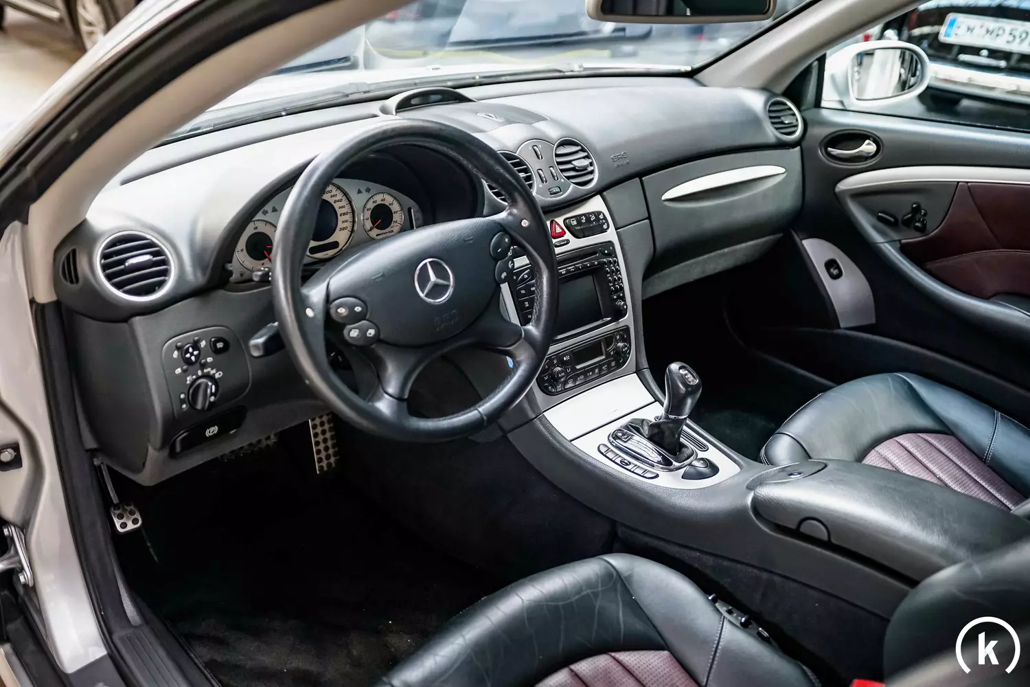 Bicolor-Ledersitze sind im Innenraum des Mercedes-Benz CLK 55 AMG Cabriolet auszumachen: Bis auf einen etwas patinierten Fahrersitz im Bereich der Sitzwangen überzeugt das Interieur durch seinen gepflegten Zustand. Fehlteile können keine aufgezählt werden, zudem halten sich auch die Gebrauchsspuren stark in Grenzen. Bei diesem CLK 55 AMG sind einige Sonderausstattungsmerkmale an Bord, dazu zählen: Einbruch-Diebstahl-Warnanlage, Thermotronic, Bi-Xrnon-Scheinwerfer, Soundsystem Harman-Kardon, Sitzheizung, Keyless-Go, Außenspiegel anklappbar, Fahrerlehnen orthopädisch, Parktronic, Abstandsregeltempomat, Memory-Paket und Comand APS mit Navigation.