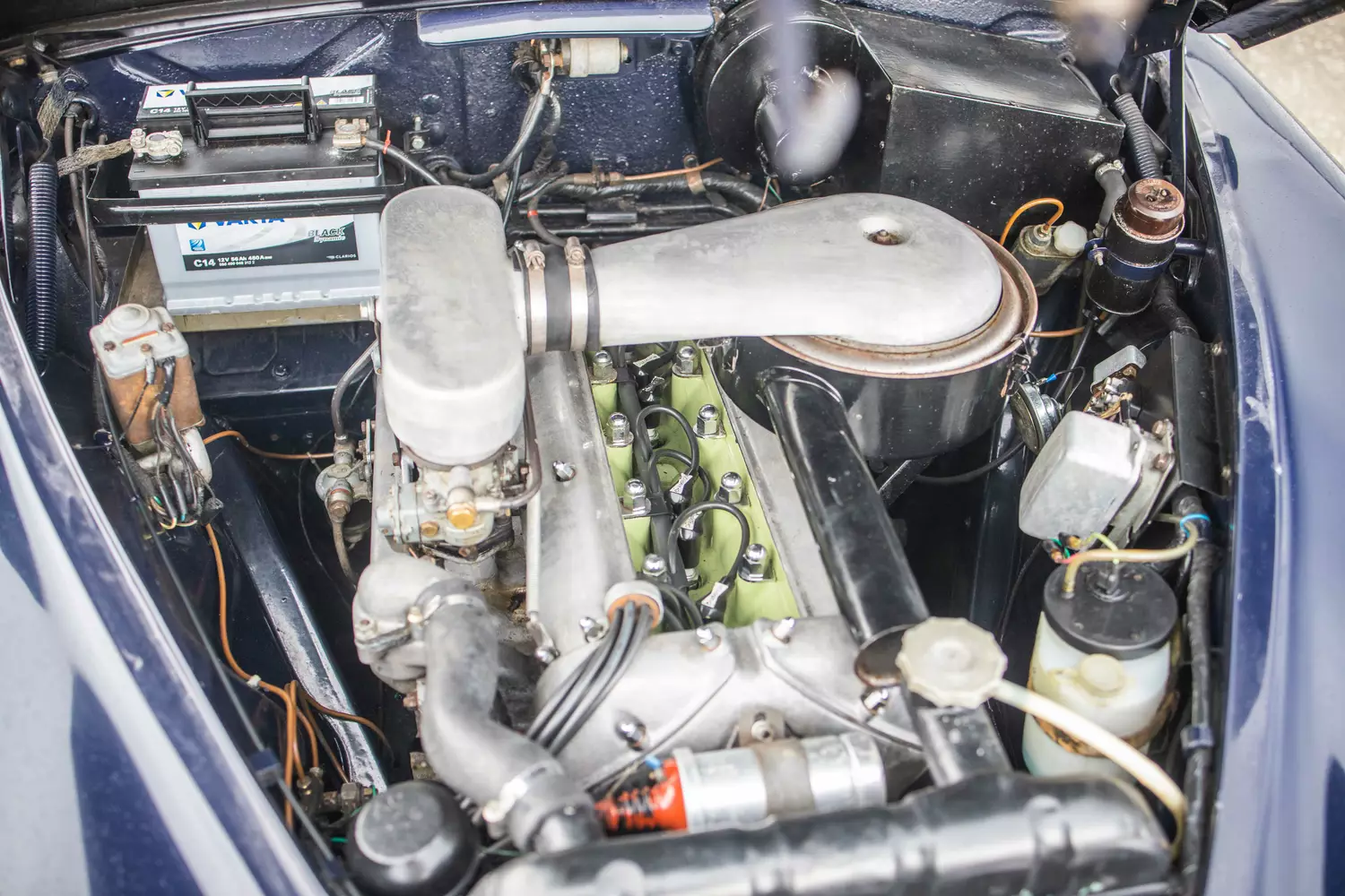 Dunkelblau verleiht diesem Jaguar eine schlichte Eleganz, eine Nachlackierung fand laut Angaben des Verkäufers noch nicht statt, folge dessen sind auch leichtere Gebrauchsspuren sowie Spuren der Zeit am Exterieur des MK 2 nicht spurlos vorübergegangen. Doch für das Fahrzeugalter präsentiert sich der dunkelblaue Lack in einem guten Zustand ohne grobe Beschädigungen. Zudem verfügen sämtliche Chromapplikationen über eine glänzende Verfassung und gravierender Rost am Exterieur kann offensichtlich keiner vorgefunden werden. In der Frontmitte befindet sich der große Chromkühlergrill des Jaguars, die 4 Rundscheinwerfer zeigen sich unbeschädigt und in voller Funktion. Laut Aussagen des jetzigen Besitzers hat der MK 2 keinen Unfall erlitten.