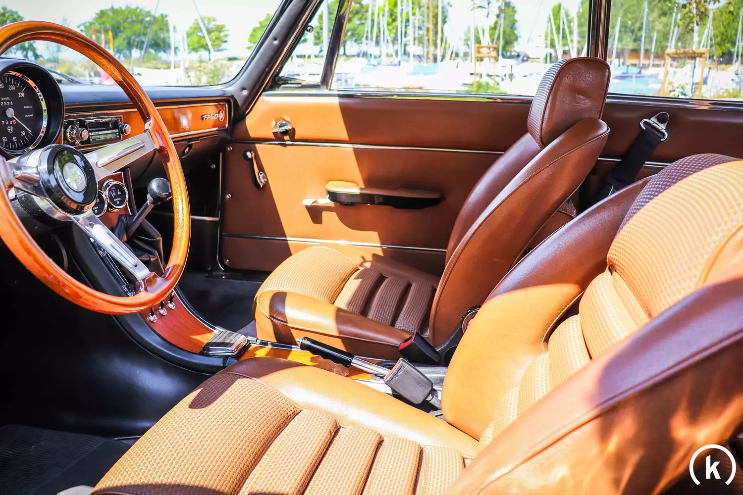 Farblich passend abgestimmt zum Exterieur präsentiert sich das in Braun gehaltene Interieur, welches neben Skai-Kunstledersitzen auch noch braune Skai-Kunstledertürtafeln aufweist. Klassisch schwarz ist das Armaturenbrett samt Fassung der Mittelkonsole gehalten, als Fahrer greift man auf ein 3-Speichen-Holzlenkrad, welches sich ohne Gebrauchsspuren zeigt. Generell sind im Innenraum des Alfa Romeo 1750 GTV Bertone keine Beschädigungen zu entdecken, welche den einwandfreien Erhaltungszustand trüben könnten. Die Fenster werden per Chromhandkurbeln betätigt, ein zeitgenössischer Radio ist als Ausstattungsmerkmal dieses Bertone zu nennen. Allen Anzeigen, Instrumenten und Bedienelementen kann eine einwandfreie Funktion zugesprochen werden.