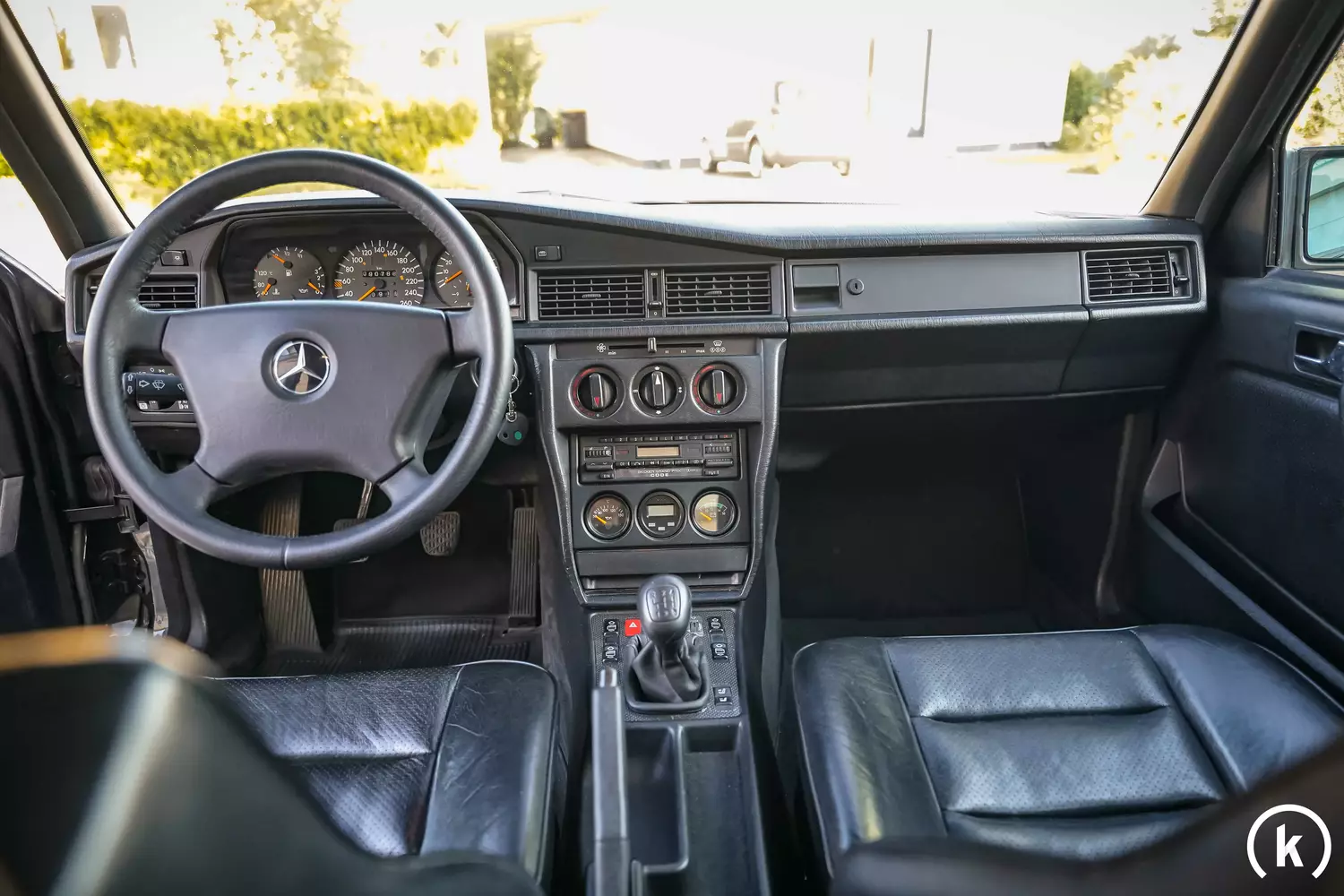 Sportlich ausgeformte Ledersitze sind im Interieur des 2.5-16 Evolution vorzufinden: Den schwarzen Vollledersitzen kann etwas Patina entnommen werden, das 4-Speichen-Lederlenkrad sowie der Lederschaltknauf präsentieren sich in sehr guter Verfassung. Beschädigungen oder gar Fehlteile im Innenraum dieses Mercedes-Benz können keine aufgezählt werden. Zur Ausstattung des Wagens zählen folgende Merkmale: Schiebedach, Servolenkung, Zentralverriegelung, elektrische Fensterheber vorne sowie hinten, Sitzheizung, ABS und ein Becker Grand-Prix Kassettenradio. Alle Instrumente, Bedienelemente und Anzeigen im Interieur des Evolutions funktionieren tadellos.