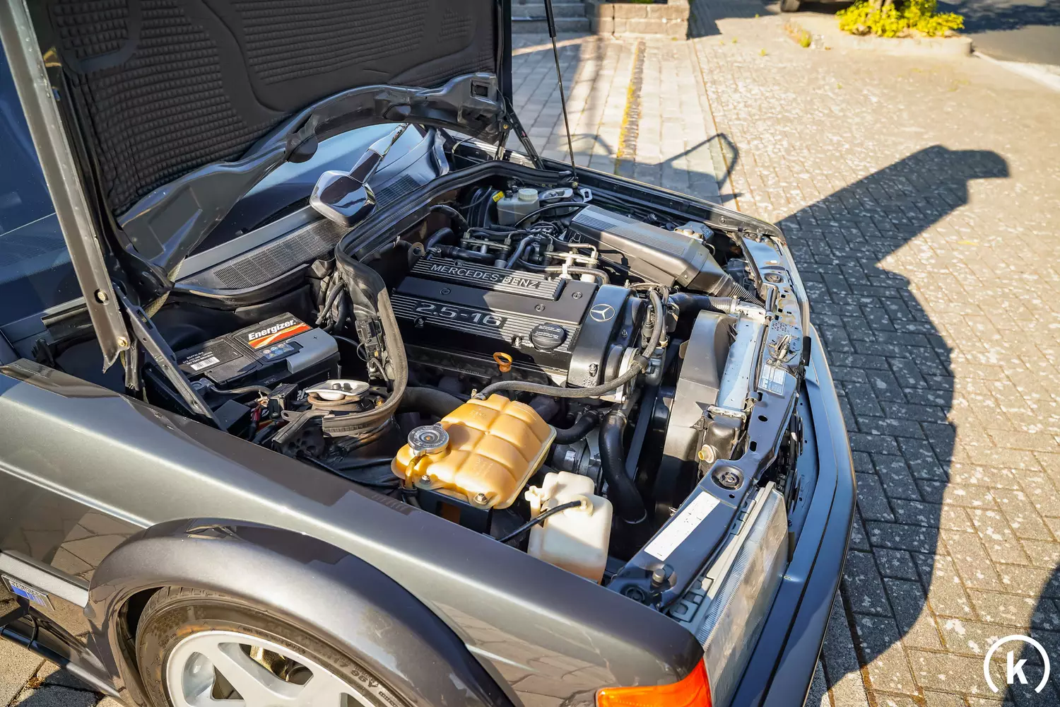 204 PS leistet der kurzhubig ausgelegte 2,5-Liter Reihenvierzylinder-Saugmotor des 2.5-16 Evolution, via 5-Gang Sportgetriebe – bei welchem der 1.Gang links hinten liegt – wird die Kraft der 4 Zylinder and die Hinterräder weitergeleitet. Laut Angaben des Verkäufers wurde ein Umbau des Hinterachsdifferenzials von 3:27 auf 3:67 vorgenommen, was dafür sorgt, dass der Mercedes-Benz im unteren Drehzahlbereich agiler fährt. Das originale Differenzial wird beim Kauf mitgegeben. Durch den Wegfall des Kars und durch das Abgasrohr vom 2.5-16 hat der Wagen 204 statt 195 PS. Im April 2019 wurde ein letzter Service erledigt, seit 1999 war der 2.5-16 Evolution nach Angaben des jetzigen Halters nur im Sommer angemeldet und wurde dementsprechend nur bei Sonnenschein gefahren.
