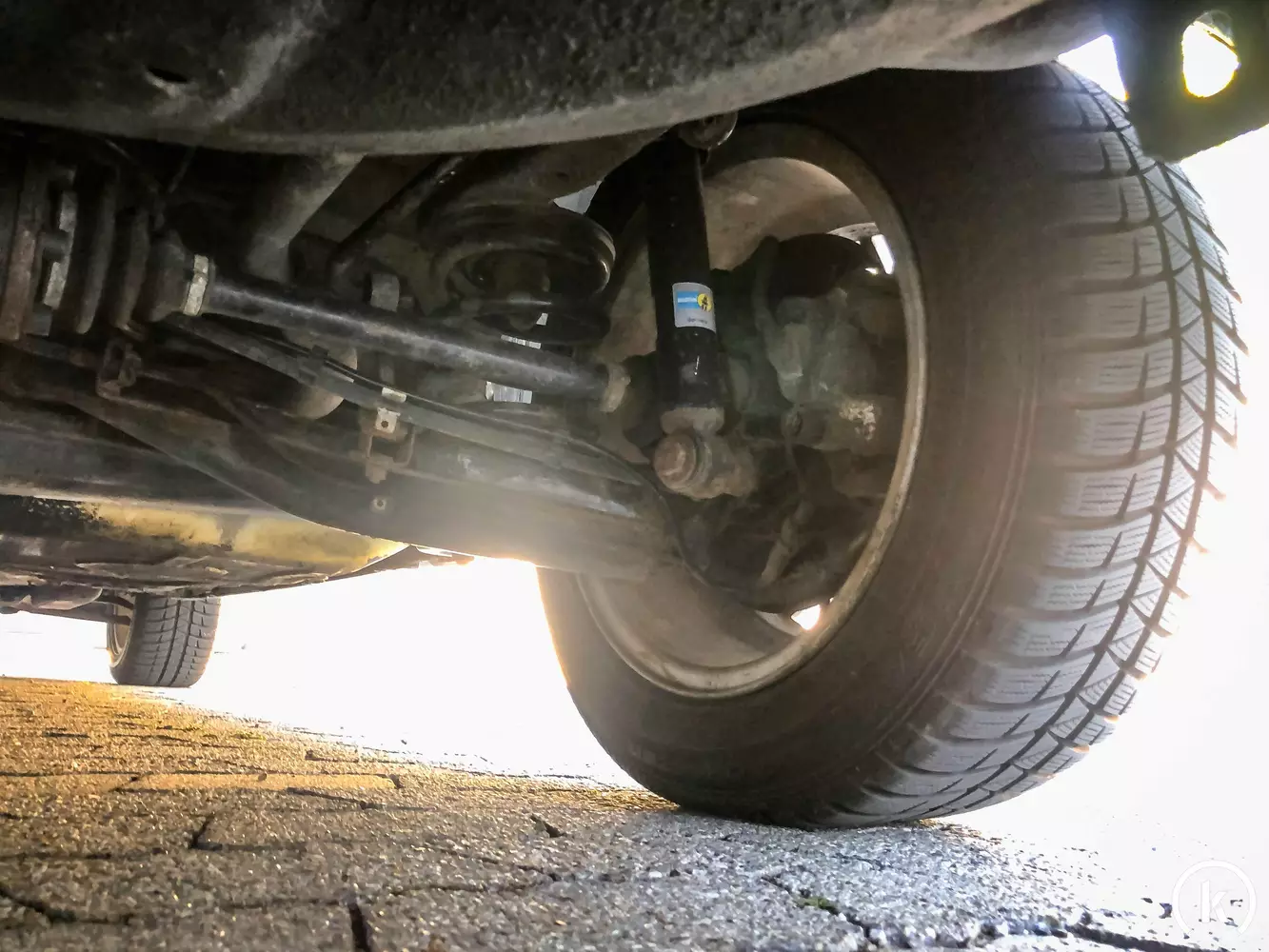 Am Wagen montiert zeigen sich originale 15 Zoll BMW BBS Mehrspeichenfelgen in einem guten Erhaltungszustand, auf diesen Alufelgen sind Reifen mit ausreichend Profil aufgezogen. Im Bereich der Bremsen können normale Gebrauchsspuren vorgefunden werden, fahrwerkstechnisch steht der BMW ab Werk durch seinen Allradantrieb etwas höher da als diejenigen E30-Modelle mit Heckantrieb.