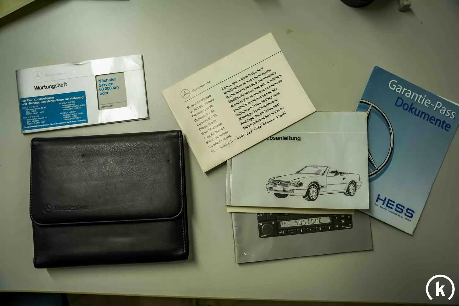 Fünf Rundinstrumente von schlichter Funktionalität befinden sich im Blickfeld des Fahrers: Der digitale Kilometerzähler zeigt eine Laufleistung von 118.500 Kilometern an. Die vollständige Bordmappe inklusive eines teilweise geführten Scheckhefts liegt vor – dadurch kann die Kilometerleistung des SL 320 belegt werden. Den Instrumenten im Innenraum ist eine einwandfreie Funktion zu attestieren.