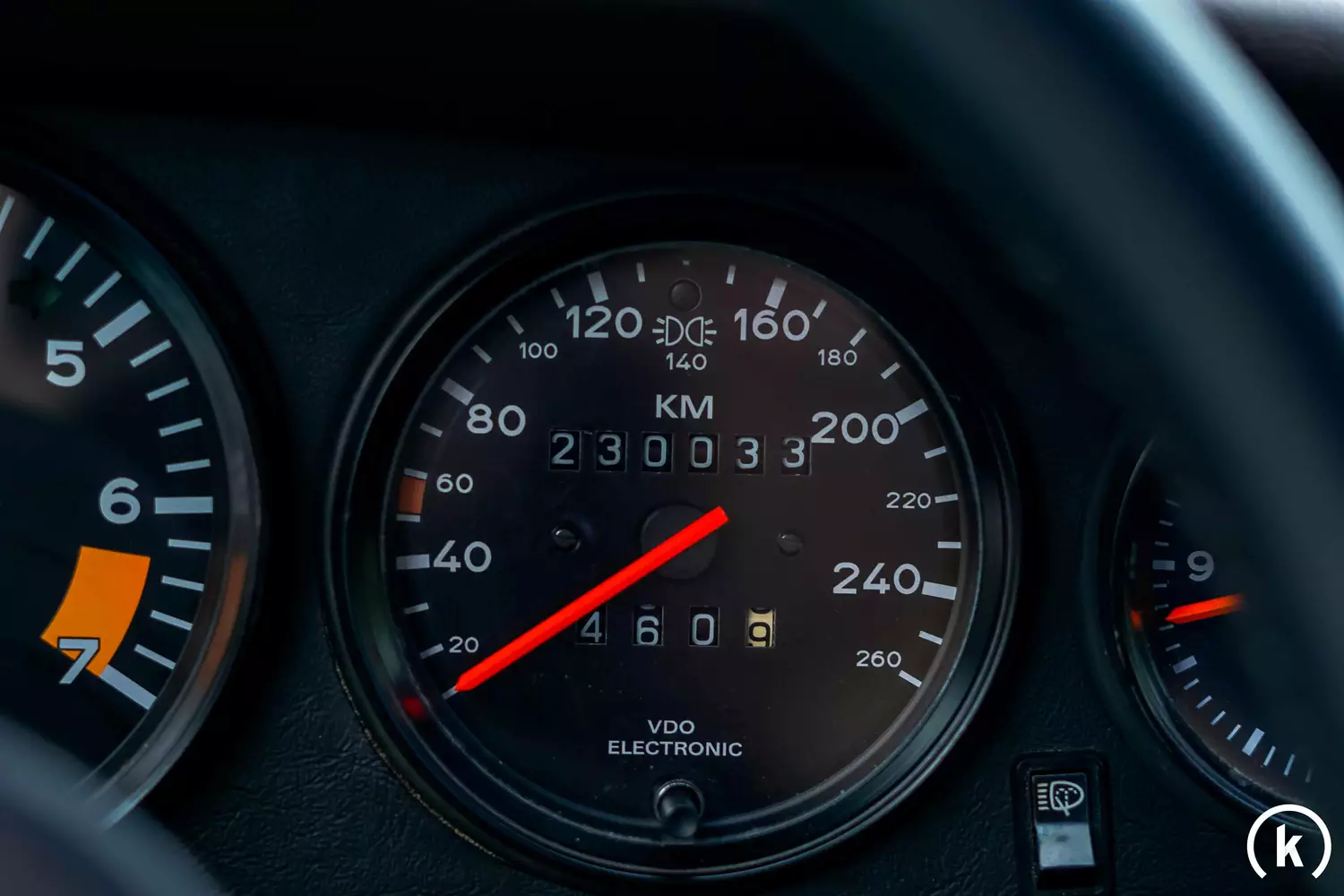Ein Blick auf die klassische Uhrenansammlung im Cockpit lässt auch den Kilometerstand herauslesen: Der Tacho zeigt eine Laufleistung von 230.030 Kilometern an. Dieser Targa wurde bereits auf deutsche Armaturen mit KM-Anzeige umgerüstet. Laut Verkäuferangaben kann der Kilometerstand teilweise nachvollzogen werden. Zu den vorhandenen Unterlagen zählt ein technisches Datenblatt von Porsche Classic. Den Instrumenten ist eine anstandslose Funktion zu attestieren.