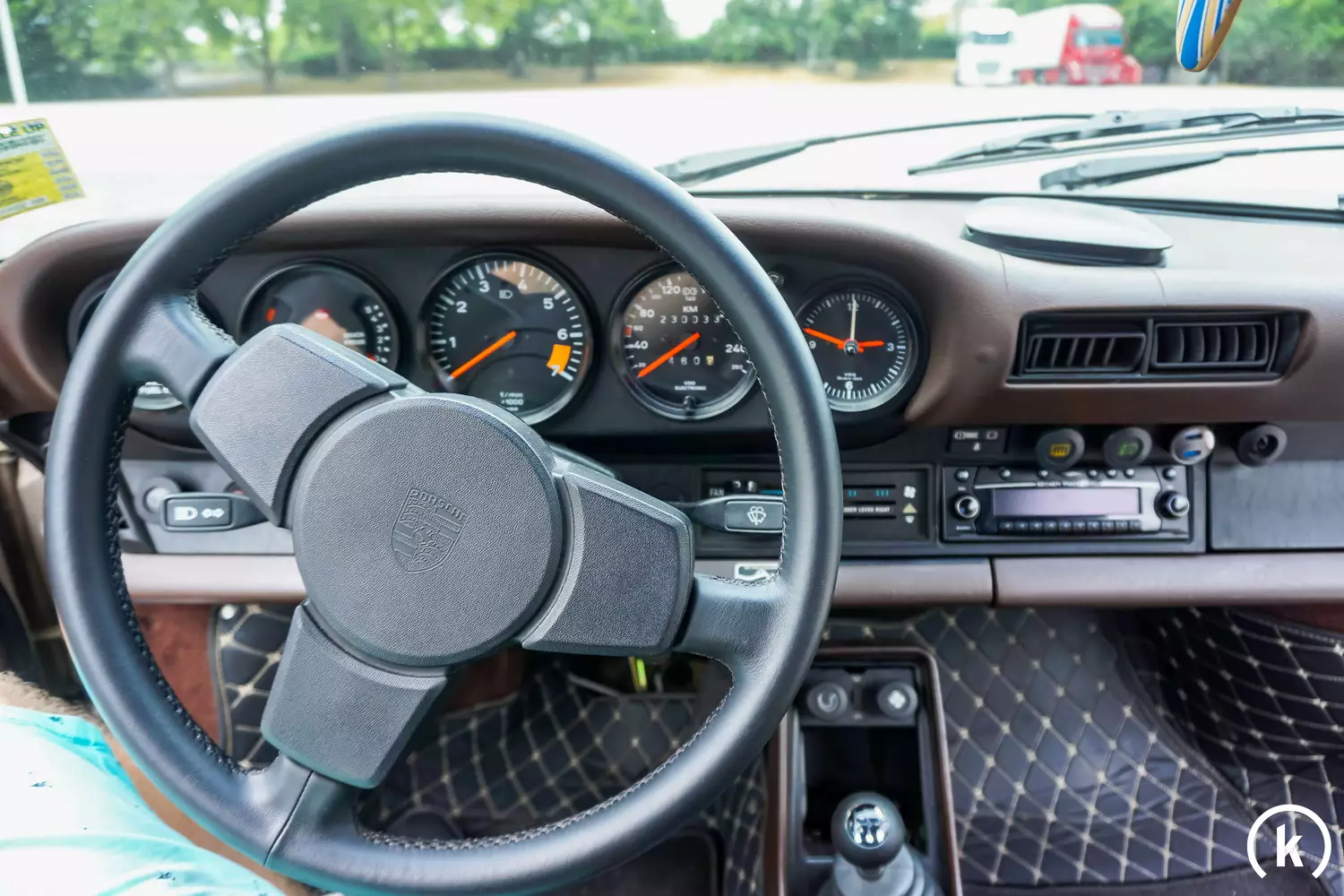 Ein Blick auf die klassische Uhrenansammlung im Cockpit lässt auch den Kilometerstand herauslesen: Der Tacho zeigt eine Laufleistung von 230.030 Kilometern an. Dieser Targa wurde bereits auf deutsche Armaturen mit KM-Anzeige umgerüstet. Laut Verkäuferangaben kann der Kilometerstand teilweise nachvollzogen werden. Zu den vorhandenen Unterlagen zählt ein technisches Datenblatt von Porsche Classic. Den Instrumenten ist eine anstandslose Funktion zu attestieren.