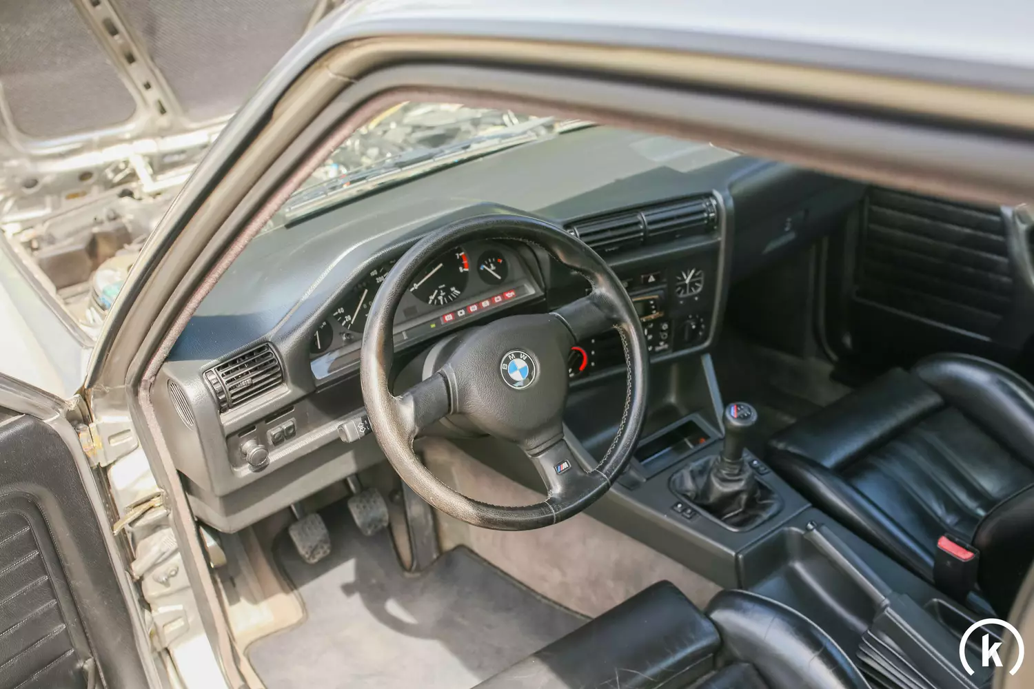 Im Interieur des BMW 320iS erblickt man als erstes unter anderem die Vollledersportsitze mit Schenkelauflagenverstellung, welche sich bis auf einen leicht patinierten Fahrersitz in guter Verfassung befinden. Etwas abgenutzt zeigt sich das M-Technik Lederlenkrad, dem Schaltknauf sind aber keinerlei Verschleißspuren zu entnehmen. Ausstattungsseitig sind an Bord dieses BMW 320iS folgende Merkmale hervorzuheben: Servolenkung, elektrische Fensterheber, Zentralverriegelung, Klimaanlage, Ausstellfenster hinten, ABS, Sperrdifferential und ein Blaupunkt Zubehörradio. Allen Instrumenten im Innenraum kann eine einwandfreie Funktion attestiert werden.