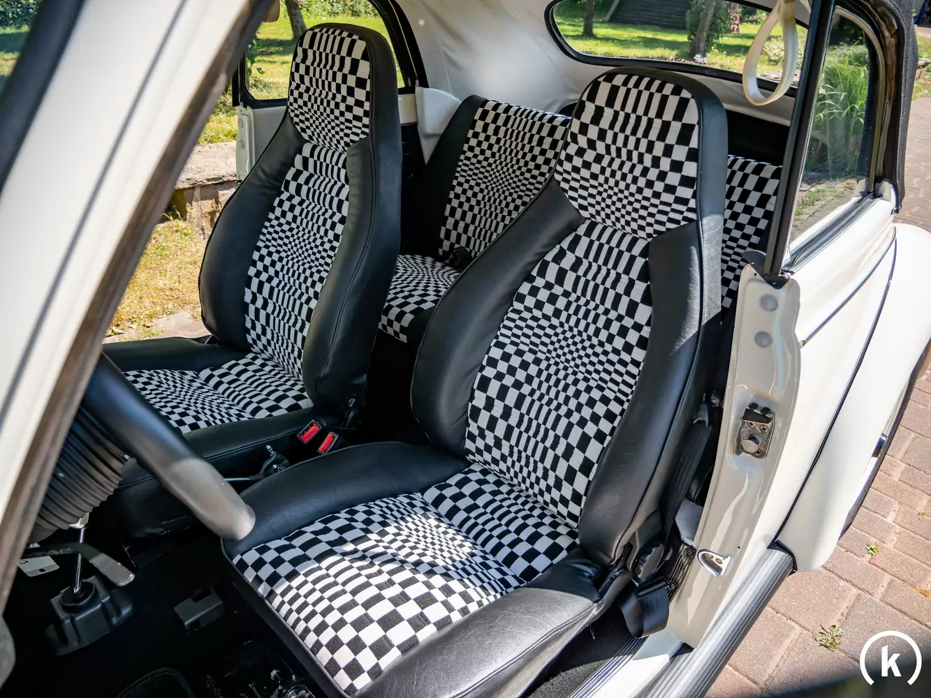 Der Innenraum dieses Käfers kann sich richtig sehen lassen, die eingebauten Porsche Sportsitze, mit „Pascha“ Muster, aus dem 911er, passen hervorragend zum sportlichen Lenkrad der Marke MOMO. Auf dem Armaturenbrett befinden sich eine Uhr, ein Kassettenradio „Düsseldorf“ von Blaupunkt, ein Zigarettenanzünder und Einstellungen für die Lüftung. Allgemein muss der Innenraum hervorgehoben werden, da hier keinerlei Makel gefunden werden können. Die Sitze, der Himmel, die Türtafeln, alles wurde feinsäuberlich erneuert und restauriert. Überall finden sich kleinere Details, wie z.B. die gelochten Fensterheber oder ein zeitgenössischer Schalthebel der Firma EMPI. Der Verkäufer gibt an, dass die gesamte Innenausstattung und das Verdeck komplett neu und demnach in einem absolut fantastischen Zustand sind.