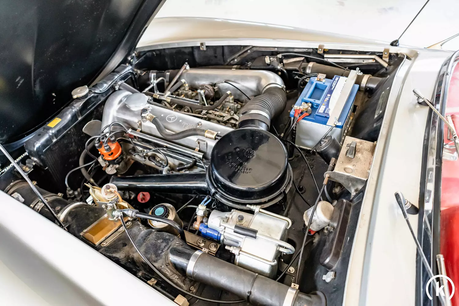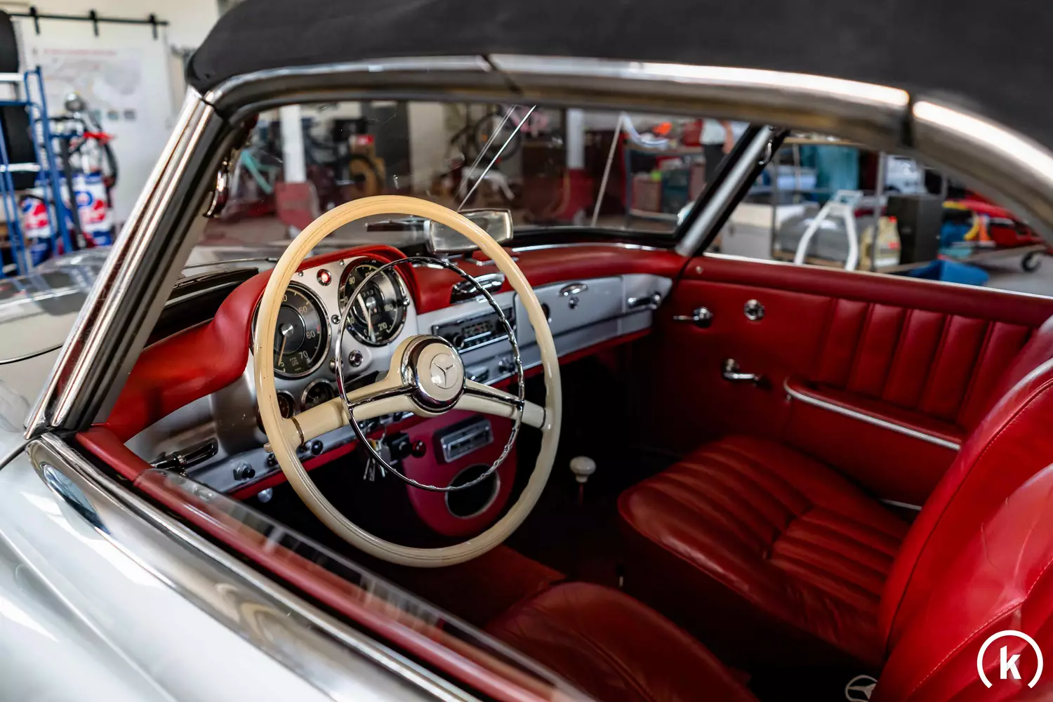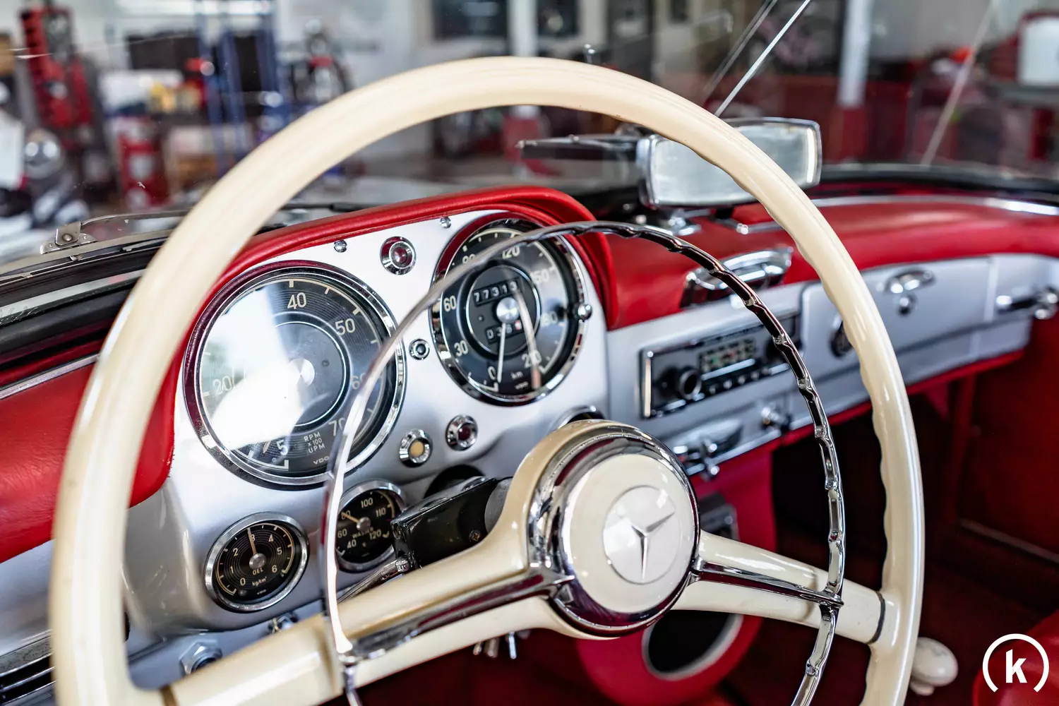 Eine Verwandtschaft zum 300 SL (Flügeltürer) weist das Armaturenbrett des 190 SL auf: Links Drehzahlmesser, rechts Tachometer, darunter 3 Zusatzinstrumente. Ca. 400 Km wurde der SL seit der Revision des Motors gefahren. Dazu zählt auch, dass der Motor geschliffen und mit neuen Laufbuchsen versehen wurde. Ebenfalls kamen neue Kolben etc. zum Einsatz. Weiter wurde die komplette Hinterachse zerlegt und generalüberholt. Die Vergaser und das Getriebe wurden revidiert. Das Bremsgerät, der Hauptbremszylinder, die Kraftstoffpumpe, die Wasserpumpe wurden erneuert. Die Radlager und die Radbremszylinder ebenfalls. Der Tacho wurde überholt. Somit hat das Fahrzeug ca. 400 km seit der Revision gefahren. Der Motor wurde rund 350 km mit Einlauföl gefahren und jetzt mit speziellem Öl versehen. Zu allen Teilen oder Reparaturen existieren Rechnungen und Belege. Die abgelesene Laufleistung beträgt 77.310. Alle Instrumente und Anzeigen im Interieur des Mercedes-Benz Roadster arbeiten anstandslos.