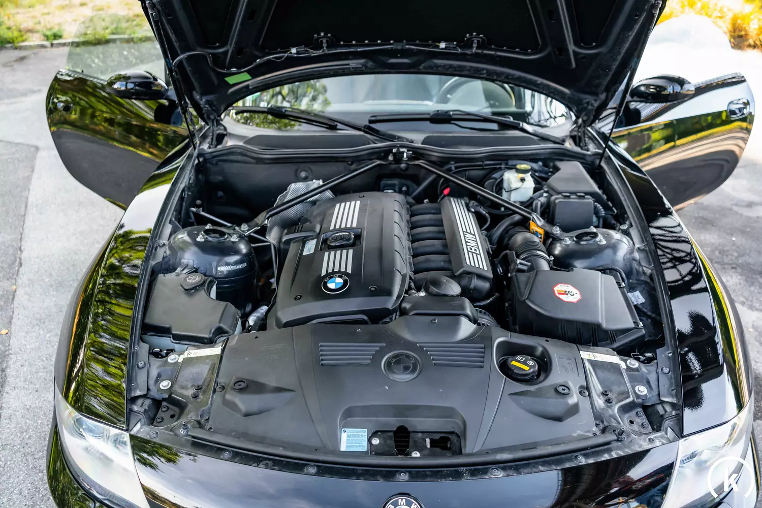 Optisch besticht dieser Z4 3.0si durch seine Schwarze Lackierung, welche laut Verkäuferangaben angesichts des Alters kaum Mängel aufweist und auch noch nie erneuert wurde – sprich dieser Roadster trägt noch seinen Erstlack. Die lange Motorhaube suggeriert perfekt den Reihensechszylinder, kurze Überhänge und das bündige Heck eines Z4 mit leicht ausgestellten hinteren Radhäusern betonen stilistisch den Antrieb auf der Hinterachse. Sämtliche Zierelemente am Fahrzeug sind vollständig und in sehr guter Verfassung erhalten. Schwarz gehalten präsentiert sich auch das Verdeck dieses Roadsters: Risse im Stoff oder Beschädigungen in der Scheibe sind nicht aufzuzählen.
