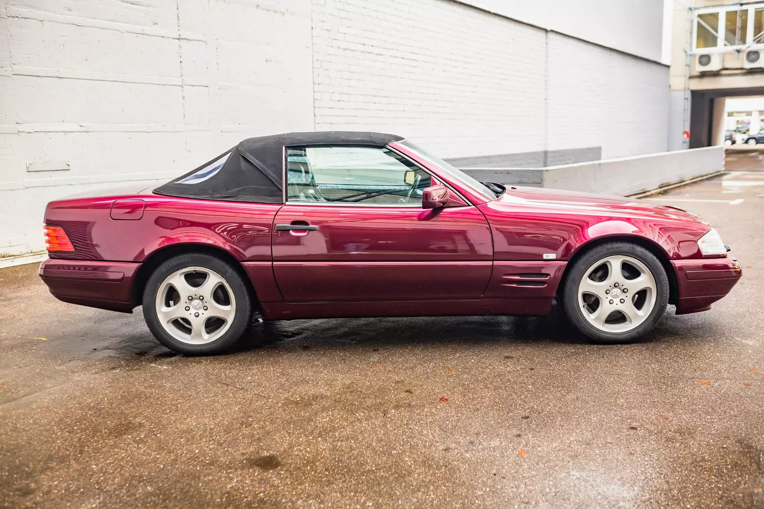 Der SL trägt den Farbton Rubinrot Metallic 5720 und wurde teilweise nachlackiert. Das serienmäßige Hardtop ist ebenfalls in Wagenfarbe lackiert, während das schwarze Faltdach mit hell abgesetzten Nähten einen harmonischen Kontrast zur Außenlackierung schafft. Die Stoßfänger und elektrisch einklappbaren Außenspiegel sind in Wagenfarbe lackiert. Dezenter Einsatz von Chrom im Kühlergrill, Fensterrahmen und Zierleiste am Heck setzen optische Akzente. Der SL hat serienmäßig weiße Blinker vorn und verfügt über ein drittes Bremslicht, welches in die Kofferraumklappe integriert ist. Eine Scheinwerferreinigungsanlage sorgt für allzeit klare Sicht. Das Fahrzeug hat kleine altersbedingte Gebrauchsspuren, größere Mängel oder Modifikationen an diesem Auto sind nicht bekannt.