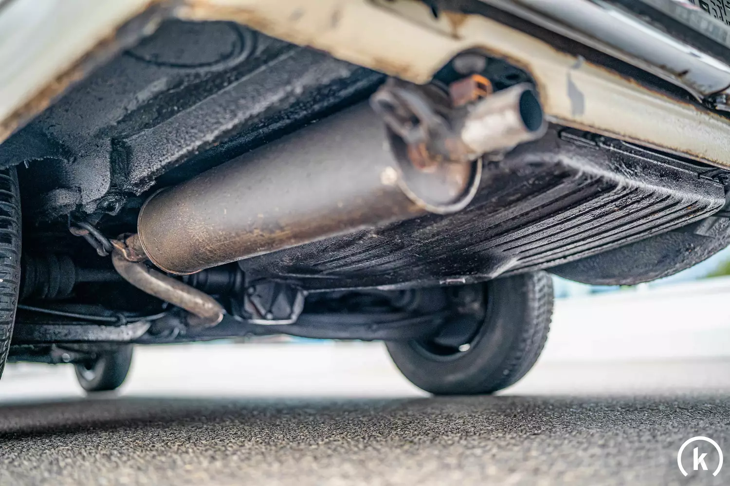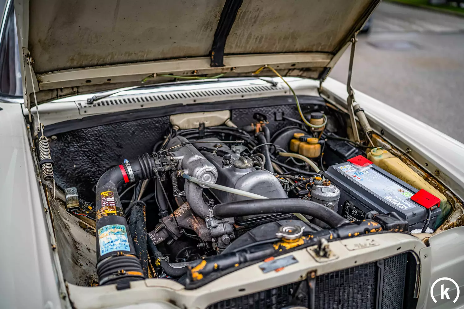 Der Mercedes 220 der Baureihe W115 präsentiert sich in einer eleganten cremefarbenen Optik, die an einigen Stellen aufgefrischt wurde. Nachlackierungen erfolgten an den Radläufen und der Heckklappe, an manchen Stellen vor allem im Frontbereich existieren Farbbeeinträchtigungen. Diese entstanden aufgrund von Steinschlag, am linken hinteren Radlauf trübt ein Kratzer die ansonsten sehr schöne Optik. Beulen, Dellen oder sonstige Beschädigungen konnten nicht festgestellt werden, ebenso war an der in über 50 Jahren unveränderten Karosserie kein Korrosionsbefall zu entdecken.