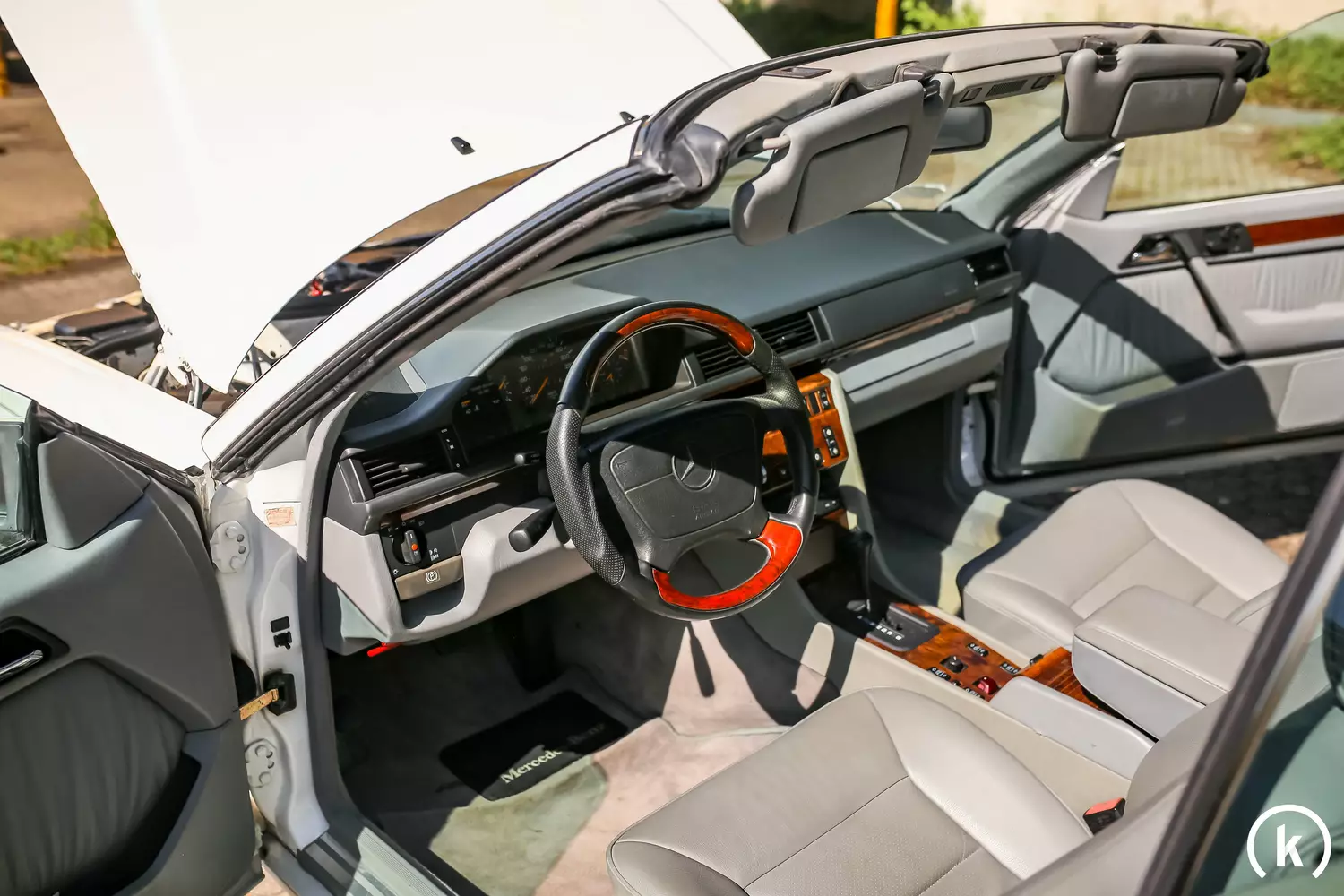 Graues Leder ziert den Innenraum dieses E 320 Cabriolets von Mercedes-Benz: 4 Personen können ohne weiteres an allen Plätzen gemütlich mitfahren, ohne dass ein Gefühl der Enge aufkommt. Nennenswerte Schäden im Interieur des 124ers können dem momentanen Halter zufolge nicht aufgezählt werden, Fehlteile im Inneren des Cabrios gibt es nicht. Nach Entschlüsselung der Sonderausstattungscodes befinden sich folgende Ausstattungsmerkmale an Bord dieses Mercedes-Benz: Elektrisch verstellbare Sitze, Sitzheizung, Fahrersitz mit Memory, Außentemperaturanzeige, Ablagebox in Ablageschale vorne, Airbag für Beifahrer, 3.Bremsleuchte, Tempomat, elektrisch einstellbare Lenksäule, Antriebsschlupfregelung (ASR), Einbruch- und Diebstahlwarnanlage (EDW), Klimaautomatik, Wärmedämmendes Glas rundum, Scheinwerferreinigungsanlage, Soundanlage, Radio MB „Exquisit“. Sämtliche Ausstattungsoptionen funktionieren tadellos, zudem lässt sich auch das Verdeck einwandfrei öffnen und wieder schließen.