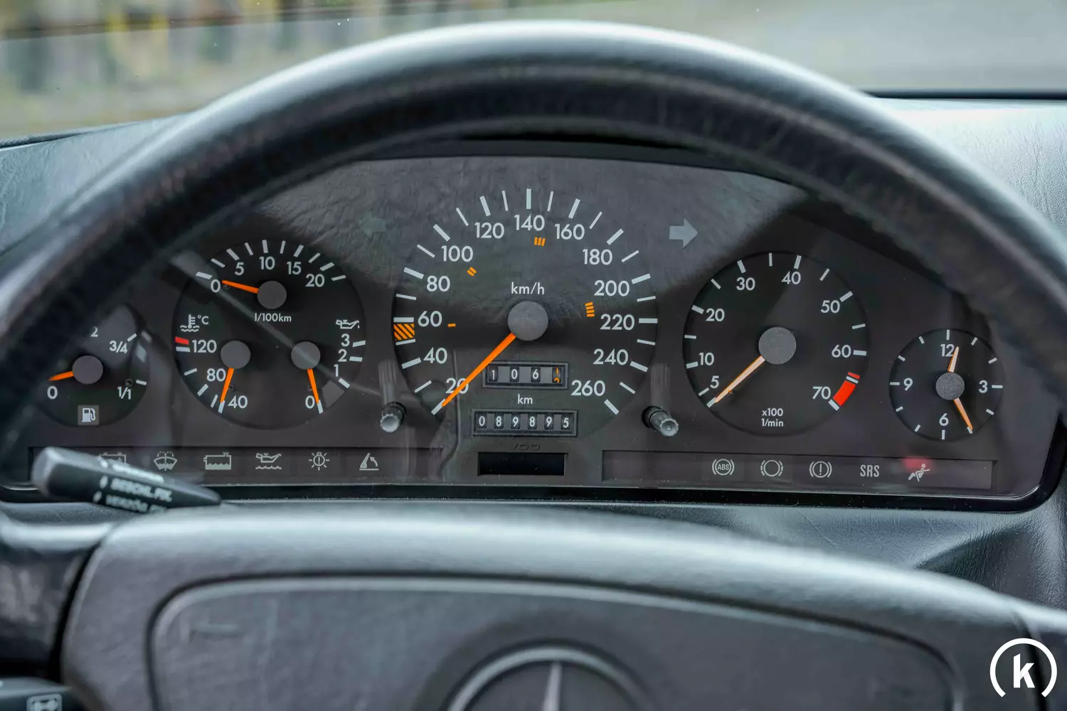 Gewohnt sachlich geht es auch hinter dem Lenkrad des SL zu, wo fünf Rundinstrumente den Fahrer mit sämtlichen relevanten Informationen versorgen. Am mittig angebrachten, sechsstelligen Tachometer lässt sich eine Gesamtlaufleistung von 89895km ablesen, welche sich über beiliegende Dokumente wie Rechnungen und Prüfberichte nachvollziehen lässt. Sämtliche Instrumente funktionieren den Angaben nach ohne Einschränkungen.