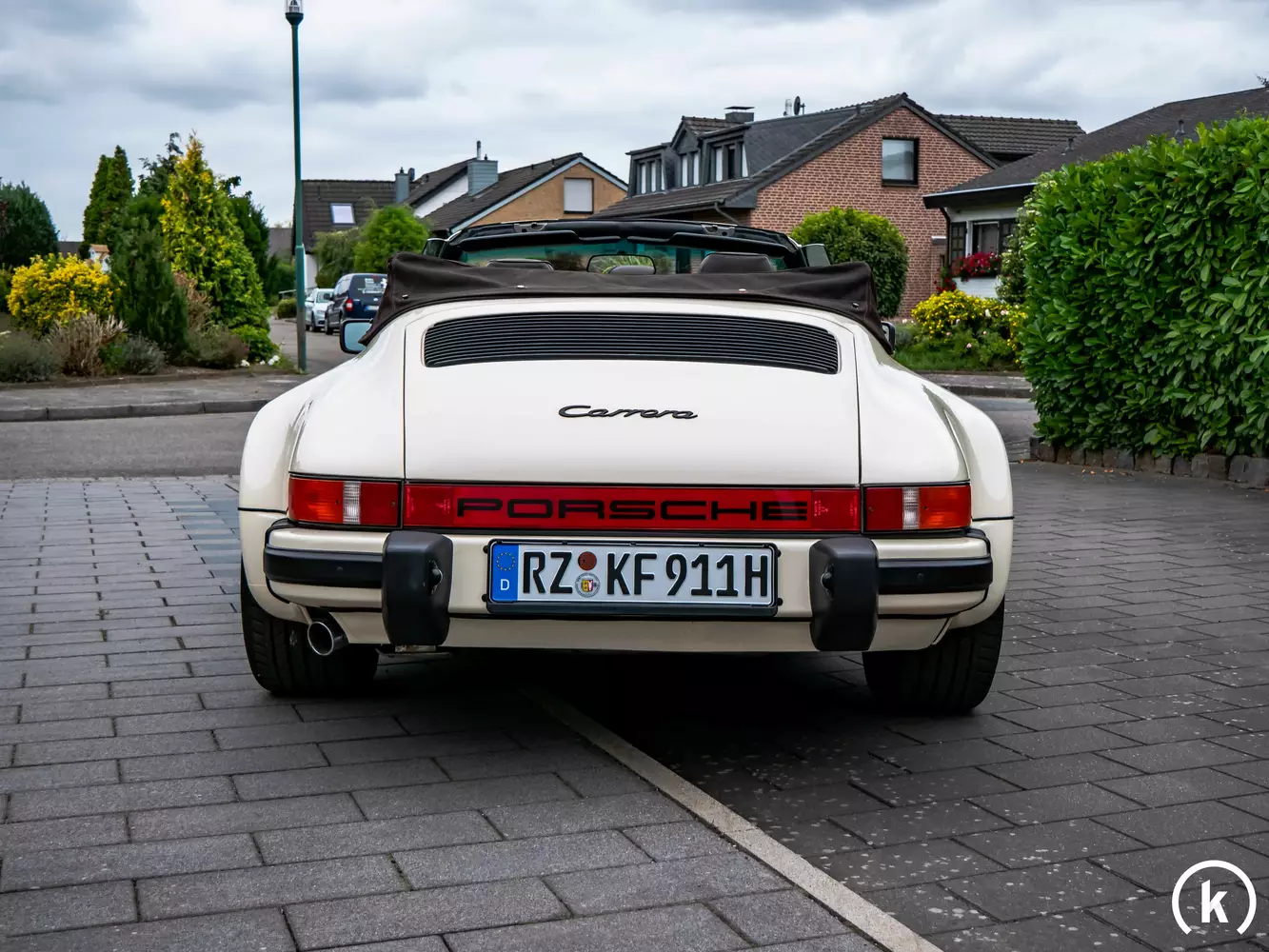 „Pastel-Beige“, Farbcode 1427: So nennt sich die edel klingende und aufgrund eines minimalen Kratzers im Bereich der Fahrertüre nachlackierte Lackfarbe des Porsche 911 3.2, welche sich in einem tadellos guten Zustand befindet. Die Lackschichten werden im vorhandenen Gutachten als glänzend und gleichmäßig ausgewiesen und rundum wurden Lackschichten zwischen 230 und 500 mü gemessen. Als Besonderheit verfügt dieser Carrera ab Werk über Karosserieverbreiterungen, welche in dieser Art normalerweise nur beim 911 Turbo serienmäßig angewandt wurden, dies wird als sogenannter Werks-Turbo-Look bezeichnet. Front- sowie Heckstoßstange weisen keine Dellen auf, nach Rücksprache mit dem Verkäufer und laut Gutachten ist dieser 911er unfallfrei. Das in dunkelem Braun gehalten Stoffverdeck ist ebenfalls in gutem Zustand und frei von Beschädigungen, zudem weist auch die Plastikheckscheibe keine Risse auf.