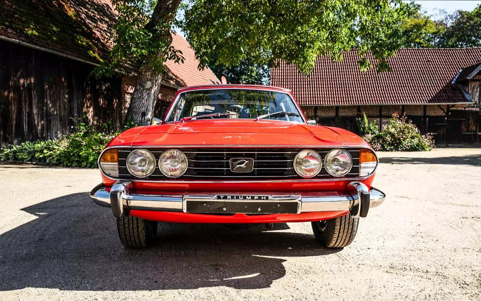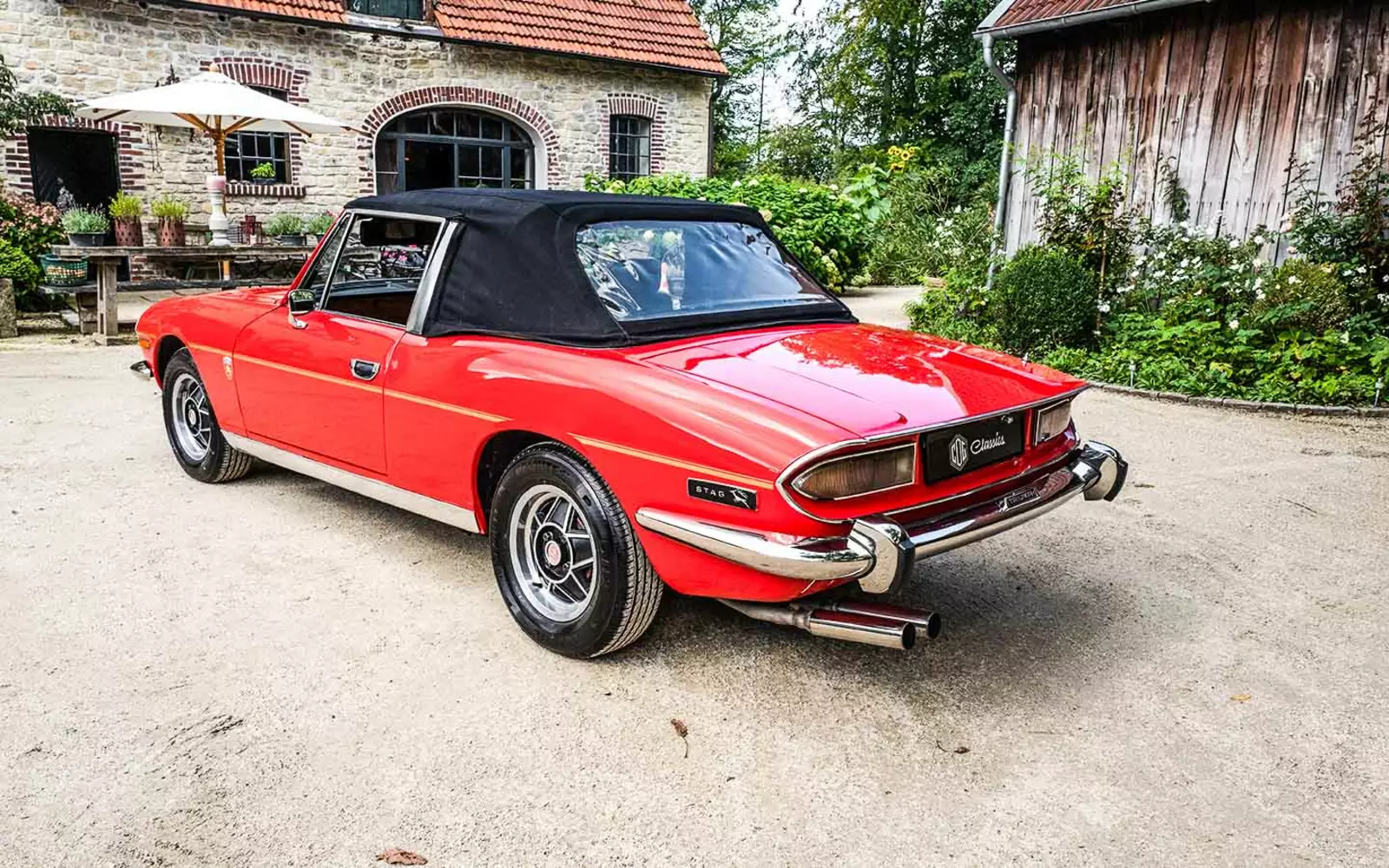 Der Triumph Stag ist ein von 1970 bis 1977 produzierter Sportwagen des britischen Automobilherstellers British Leyland. Der Entwurf stammt vom Turiner Designer Giovanni Michelotti. Das Besondere an diesem nur also Cabriolet produzierten Sportlers ist der Überrollbügel und die festen Türrahmen, die das Fahrzeug zu einem der ersten Sicherheit-Cabriolets machen, besser bekannt als Targa. Nach den Triumph Modellen TR5 und dessen Nachfolger TR6 sowie dem Spitfire, war der Stag das dritte Cabriolet des Automobilherstellers. Als Spitzenmodell der Marke sollte der Stag die Lücke zwischen dem MGB und dem Jaguar E-Type innerhalb des Konzerns British Leyland schließen. Obwohl der Triumph offiziell keine Modellpflege erfuhr, lassen sich intern die zwei Baureihen Mark I und Mark II unterscheiden. Unter Letztere fallen die ab Februar 1973 produzierten Fahrzeuge. Wesentliche Änderungen waren hier unter anderem überarbeitete Brennräume in den Zylindern, neu konstruierte Kolben, ein Stoffverdeck ohne die seitlichen Dreiecksfenster, ein mattschwarz unterlegter Kühlergrill und Schweller sowie Zierstreifen an den Wagenflanken. Der Stag besitzt einen Achtzylinder-V-Motor, der auf Basis eines Reihenvierzylindes entwickelt wurde. Aus diesem Grund wird der im Stag verbaute Ottomotor oft auch als „Vierzylinder-Reihenmotor mit einer zweiten Zylinderbank“ beschrieben. Es wurden lediglich 26.000 Exemplare des Briten produziert. Eine Besonderheit des Stags war der häufige Einsatz in Filmen. So fuhr Sean Connery den Wagen 1971 als James Bond im Film “Diamantenfieber”, genauso wie Dustin Hoffman im Film “Wer Gewalt sät”.