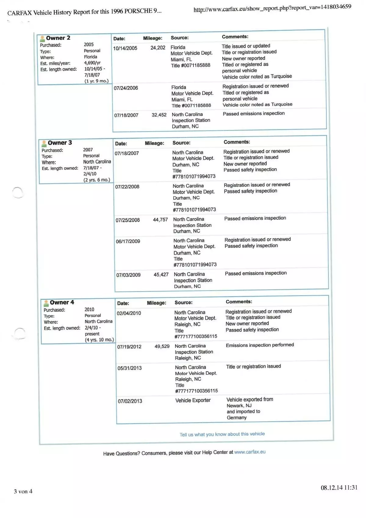 Das Fahrzeug ist im Juli 2013 von dem Händler bei dem ich es gekauft habe eingeführt worden. Der Händler ist spezialisiert auf den Import von Porsche und anderen hochwertigen Fahrzeugen aus den USA und hat in der Regel einen Lagerbestand von 50-100 Fahrzeuge die er Stück für Stück für den deutschen Markt umrüstet und verkauft. Vor diesem Hintergrund ist es nicht ungewöhnlich, daß zwischen seinem Import und meinen Kauf rund 2 Jahre vergangen sind in welcher das Fahrzeug nicht bewegt wurde. Es gibt einen Beleg einer Tachoumrüstung aus dem Jahr 2014 in welchem der Tacho von 50163 mls auf 80260km umgerüstet wurde. Ich habe das Fahrzeug dann mit diesem Kilometerstand in 2015 gekauft und bin seit dem rund 15000 km selber gefahren, der aktuelle KM-Stand beträgt ca. 95.000