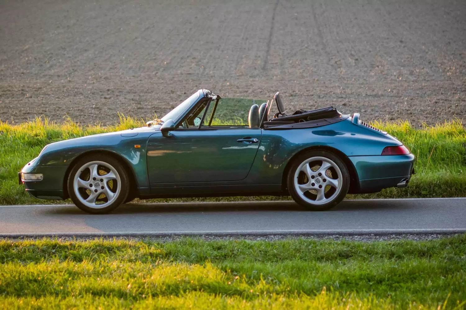 Die Frontpartie (Stoßstange, Kotflügel, Haube) wurden schon einmal nachlackiert, offenbar wegen Steinschlag. Und zwar im originalen Türkisgrünmetallic (Hersteller-Farbcode L25D). Was sehr gut mit dem grauen Cabrio-Verdeck korrespondiert. Der jetzige Besitzer hat den Porsche so übernommen, in seiner Zeit wurde nichts mehr nachlackiert. An der Karosserie wurde nichts verändert oder gar verbastelt, auch größere Schäden sucht man vergeblich. Es finden sich lediglich kaum sichtbare Gebrauchsspuren, die dem Fahrzeugalter geschuldet sind.