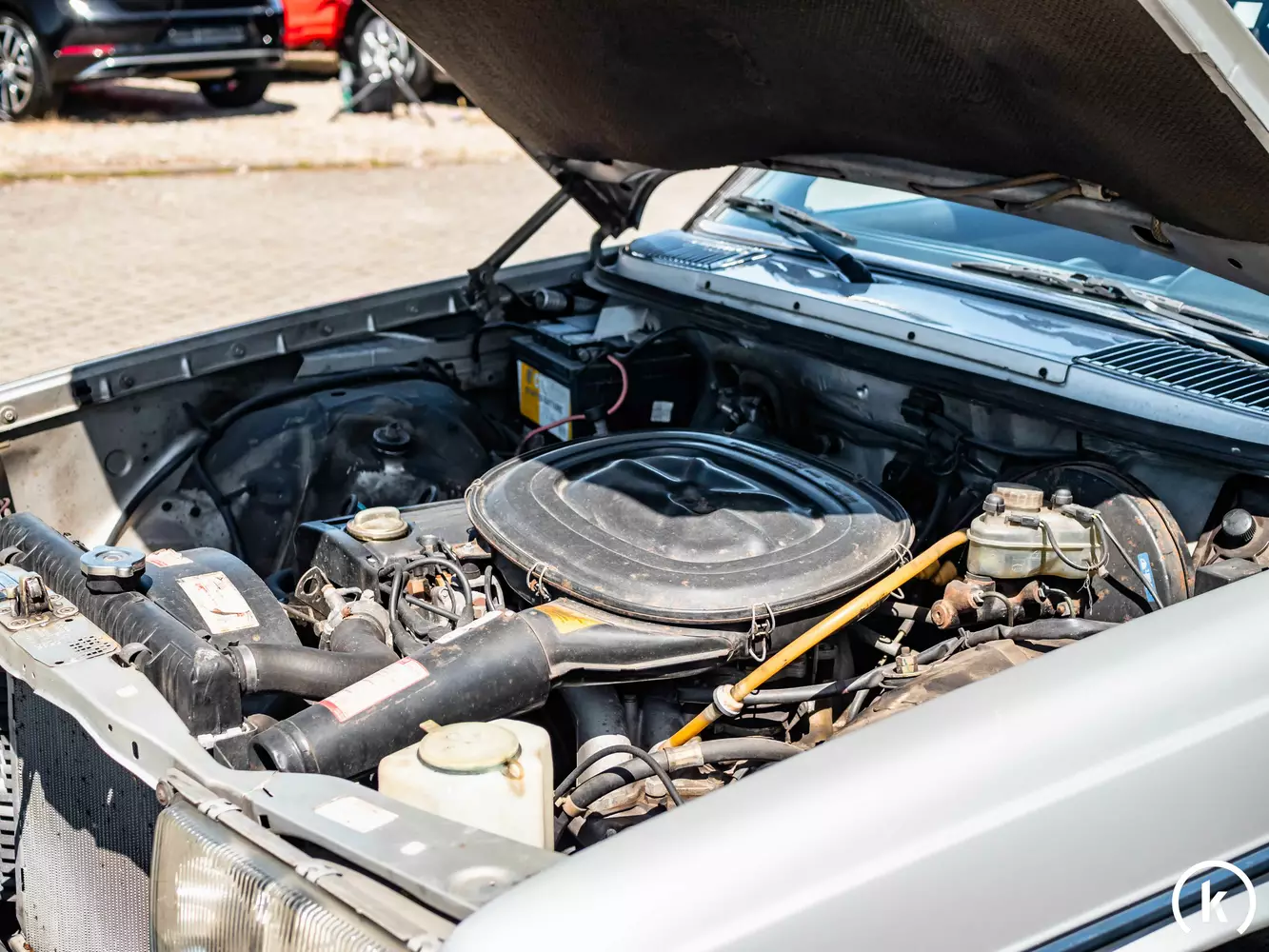 Der silberne Lack glänzt aus allen Blickwinkeln, die in der Anzeige gezeigt werden, und alle Verkleidungen sind an ihrem Platz und in gutem Zustand. Chromteile wie die schlanken Stoßstangen, Spiegelkappen und der Kühlergrill weisen keinen offensichtlichen Lochfraß auf. Laut Verkäufer wurde der Wagen komplett nachlackiert. Des Weiteren gibt der Verkäufer an, dass der Wagen in seinem Besitz unfallfrei ist und dass sich der Lack in einem guten Zustand befindet. Hier verweisen wir auf die umfangreiche Bildgalerie.