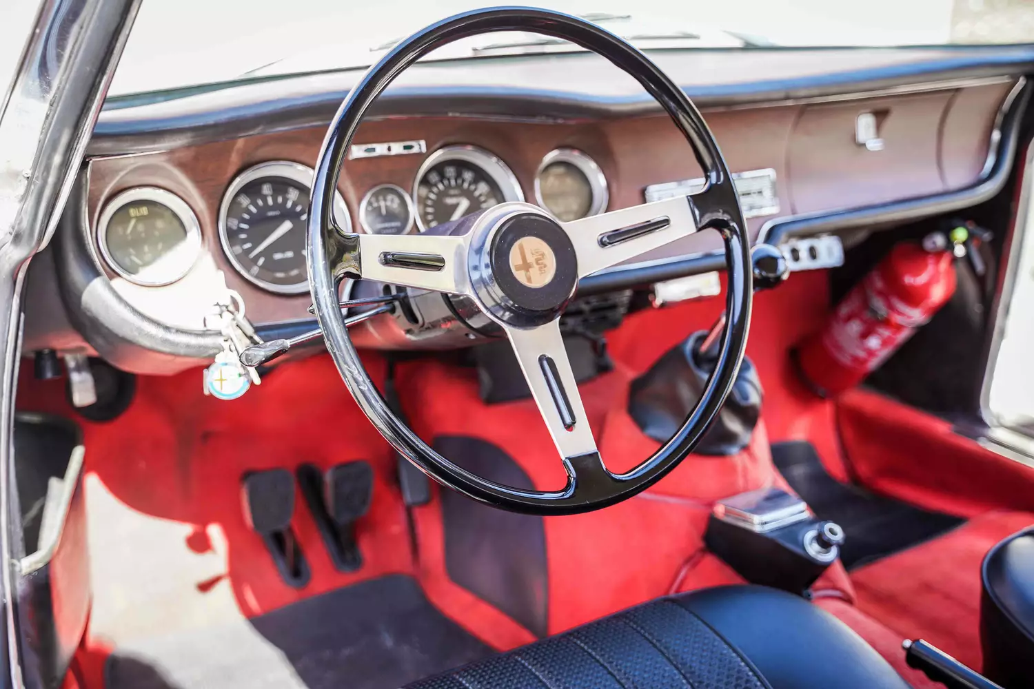 Auch im Innenraum, tutto va bene. Alles original. Das Gestühl wurde mit Original-Materialien neu aufgepolstert, neue Dreipunkt-Automatikgurte wurden vorne installiert, im Fußraum vor dem Beifahrersitz findet sich ein Feuerlöscher. Beschädigungen sucht man auch im Interieur vergeblich.