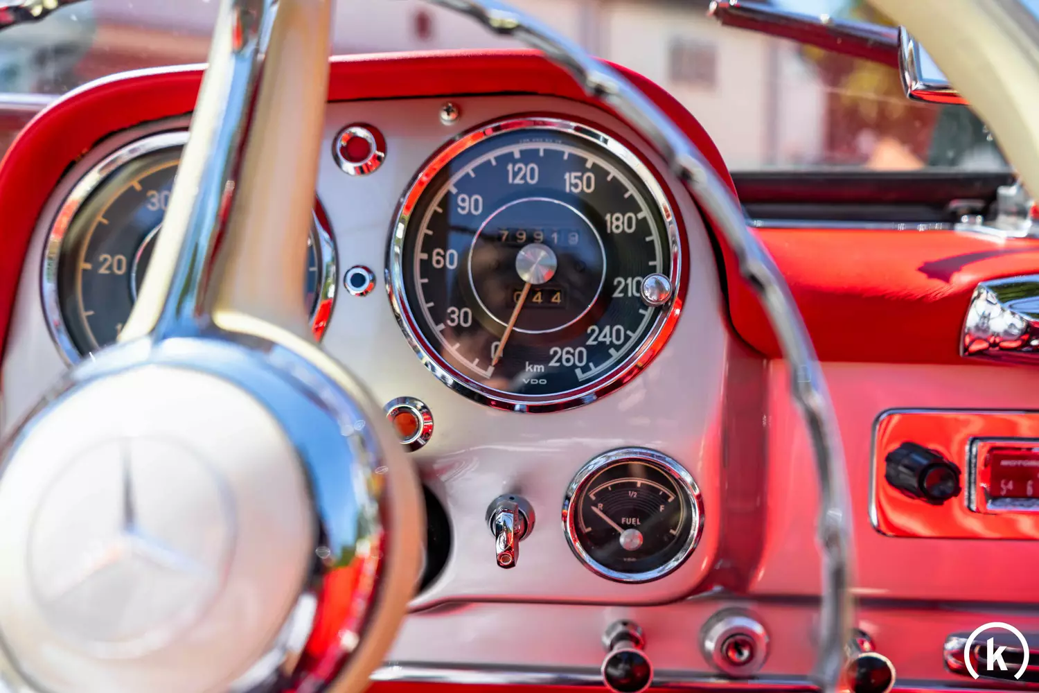 Eine Verwandtschaft zum 300 SL (Flügeltürer) weist das Armaturenbrett des 190 SL auf: Links Drehzahlmesse, rechts Tachometer, darunter 3 Zusatzinstrumente. Die abgelesene Laufleistung von 79.920 Kilometern kann laut jetzigem Besitzer zwar nicht lückenlos nachvollzogen werden, angesichts des rundum gesunden Zustandes dieses Mercedes-Benz kann der Roadster allerdings noch nicht allzu viele Kilometer gesammelt haben. Bis auf den Radio funktionieren alle Instrumente und Anzeigen ohne Probleme.