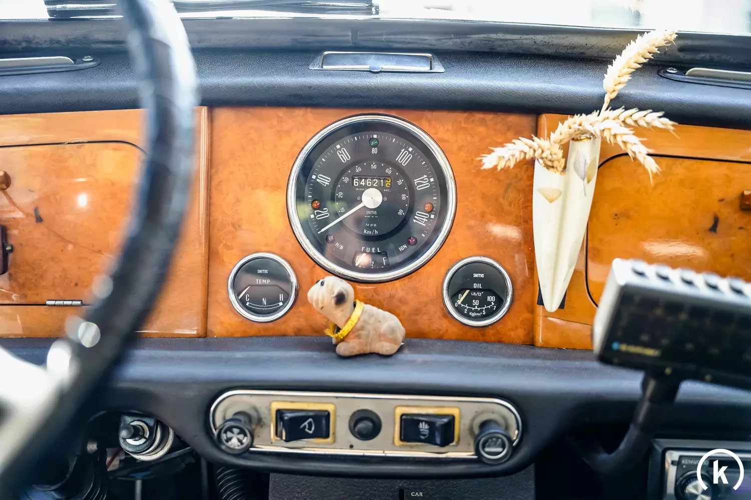 3 in Chrom gefasste Rundinstrumente halten für den Fahrer die wichtigsten Informationen bereit. Nach Rücksprache mit dem momentanen Halter hat dieses Riley Elf insgesamt ca. 64.620 Kilometer gelaufen, was zum einen durch ein teilweise geführtes Scheckheft und zum anderen durch diverse vorliegende Unterlagen belegt werden kann. Den Instrumenten im Innenraum ist eine einwandfreie Funktion zuzusprechen.