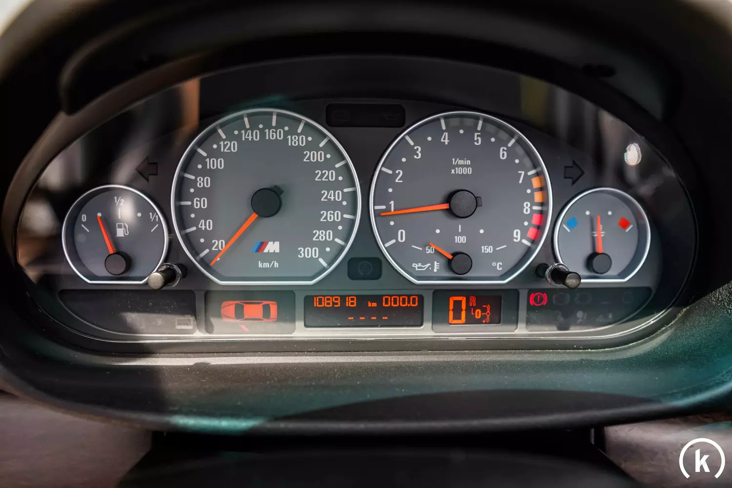 Grau hinterlegt sind die Anzeigen im Cockpit des E46 M3: Am orangefarbenen Display in der Mitte sind 108.800 Kilometer abzulesen. Die Gesamtlaufleistung dieses Wagens kann laut Aussagen des Verkäufers durch ein vollständig geführtes Scheckheft belegt werden, zudem liegt das Bordbuch mit allen Unterlagen zum Fahrzeug vor. Eine vollständige Funktion aller Instrumente und Anzeigen ist gegeben.