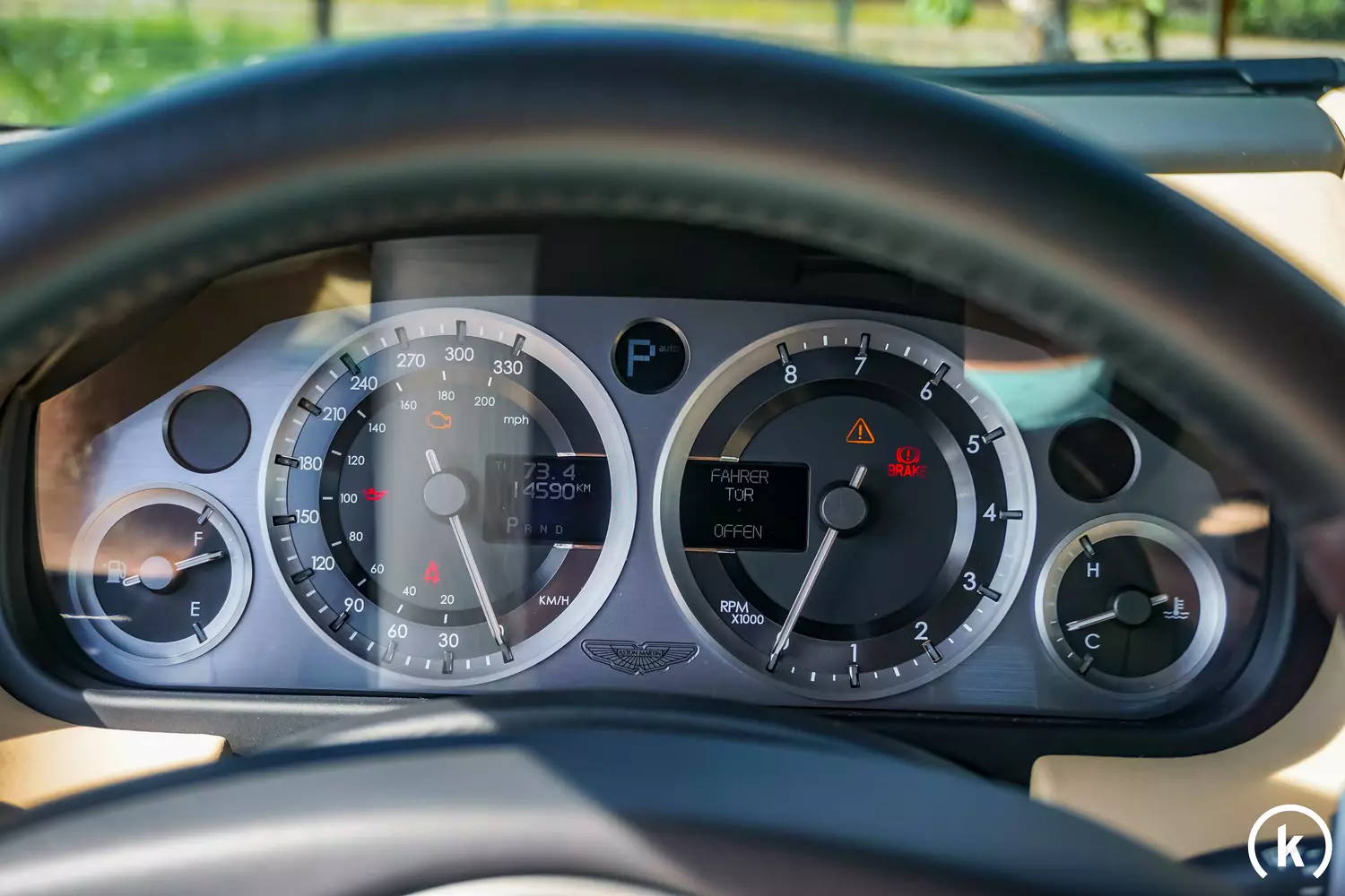 Im Innenraum des Virage findet man hochwertiges Leder in Beige und Braun, kombiniert mit einem weichen Teppich passend zum Leder. Die Armaturen glänzen in schwarzem Pianolack und glattem Aluminium, wie auf den Bildern zu erkennen, in einem wirklich sehr guten Zustand. Die Sport-Komfort-Sitze sind mit mehreren Ziernähten in der Kontrastfarbe bestickt. Hinter den beiden vorderen Sitzen befinden sich zwei Notsitze, bei denen ebenfalls nicht am Komfort gespart wurde. Ausgestattet ist der Virage, laut Besitzer, mit allem, was er zu bieten hatte. Dazu gehören elektrisch einstellbare Sitze mit Sitzheizung, ein Multifunktionslenkrad mit Tempomat, Telefonsteuerung und Schaltwippen, sowie Einstellmöglichkeiten für Fahrwerk, Sportmodus und die Klimaautomatik in der Mittelkonsole. Das Multimediasystem umfasst neben dem Radio, Bluetooth und CD auch ein Navigationssystem. Die Klappensteuerung der Abgasanlage erfolgt über eine Fernsteuerung.