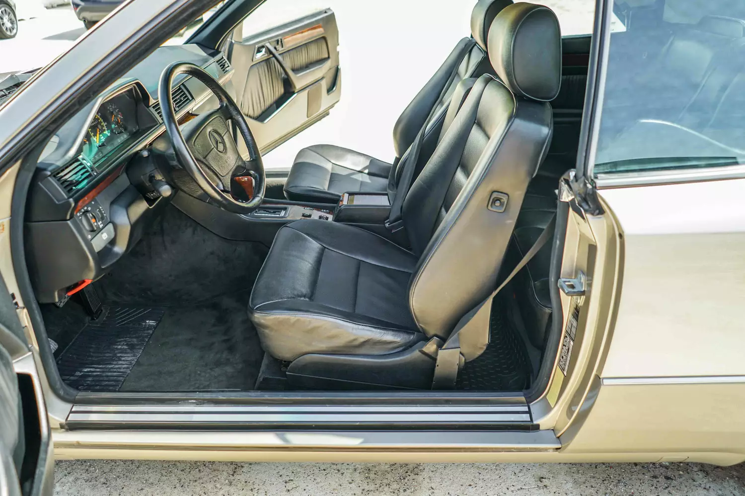 Begibt man sich ins Innere des Wagens, so heißt es erst einmal: Wohlfühlen. Das schwarze Leder harmoniert wunderbar mit der Außenfarbe. Alles wirkt edel und hochwertig, Unterstrichen wird das Innere noch durch die typischen Wurzelholzapplikationen. Das Sahnehäubchen bilden noch die Ausstattungsdetails wie Klimaanlage, elektrische Fensterheber, Seitenspiegel und Sitzeinstellung. Abgerundet wird das ganze durch einen Tempomat. Das alte Radio wurde gegen ein etwas neueres Exemplar getauscht. Alles in allem präsentiert sich der Innenraum in einem guten Zustand und weist lediglich altersentsprechende Gebrauchsspuren auf.