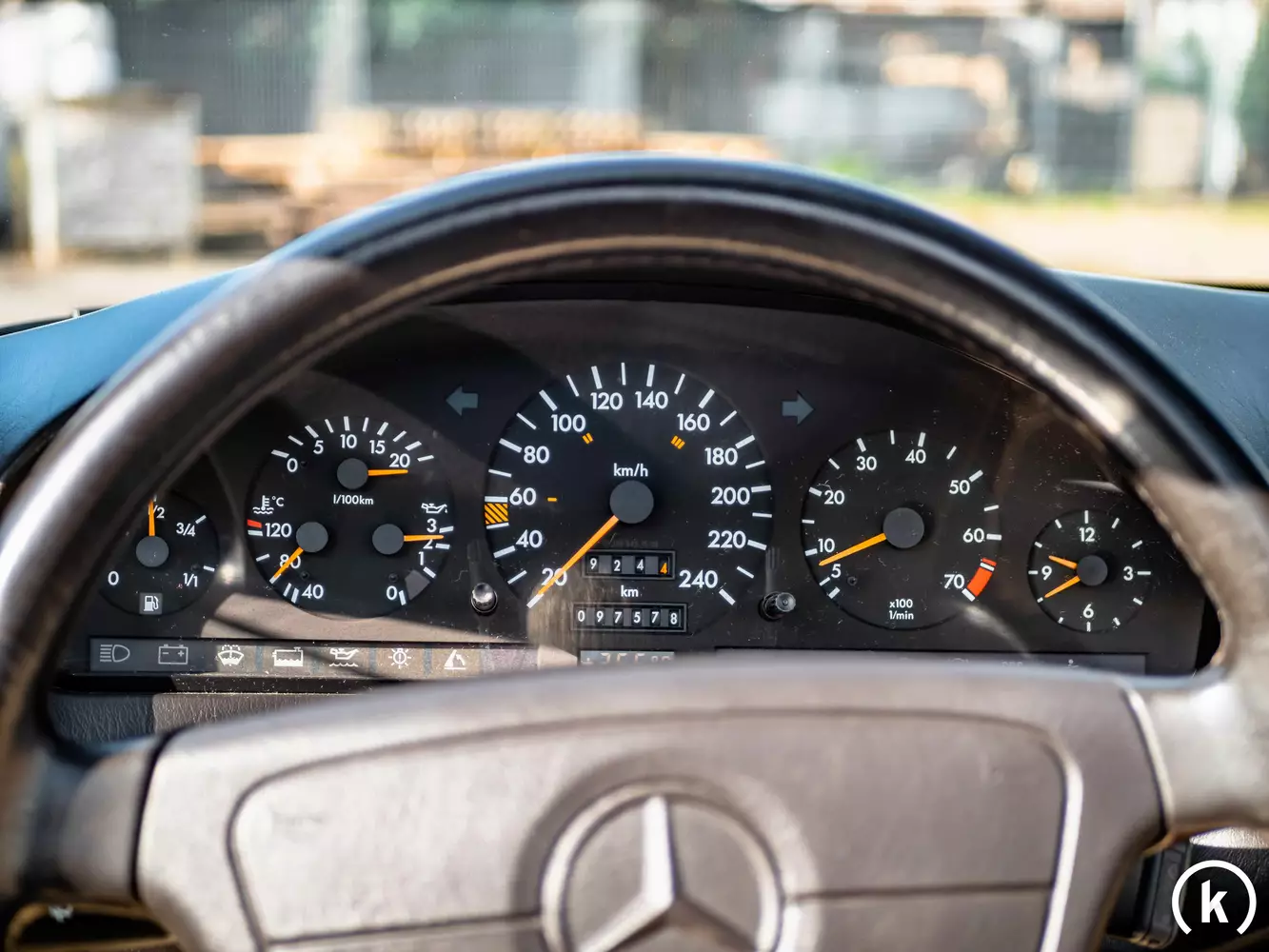 Klar ablesbare Rundinstrumente – bei denen der Geschwindigkeitsmesser im Mittelpunkt des Kombiinstruments sitzt – sorgen für schlichte Eleganz im R 129. Als Laufleistung sind 97.580 Kilometer am Tachometer abzulesen. Die Gesamtlaufleistung kann via eines teilweise geführten Scheckhefts und diverser Unterlagen nachvollzogen werden.