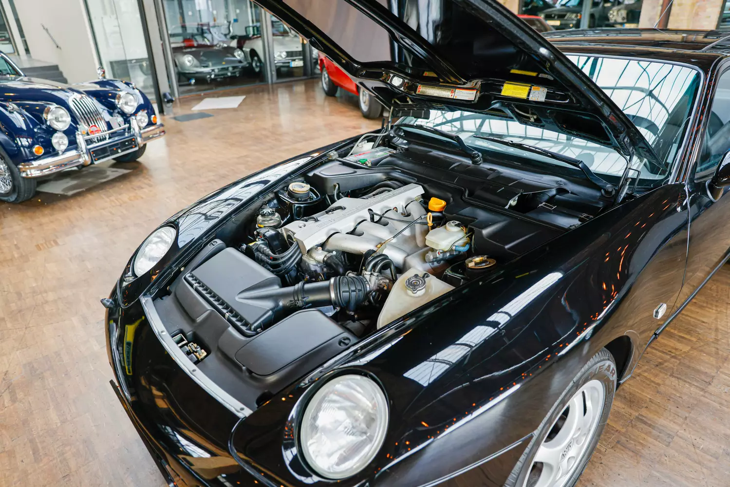 Mit dem 240 PS starken 3,0-Liter Vierzylinder setzte Porsche seinerzeit den Vierzylinder-Saugmotoren die Krone auf: Power, Effizienz und Zuverlässigkeit sind seine Stärken. Respektable 305 Newtonmeter liegen bei 4.100 Touren an. Das 5-Gang Getriebe ist Transaxletechnisch an der Hinterachse angesiedelt, die Schaltung lässt sich ohne Probleme bedienen. Im März 2021 unterzog man dem 968 einem letzten Service, bei Kilometerstand 22.403 wurden der Zahnriemen und die Wasserpumpe erneuert, zudem wechselte man das Öl. Unterbodentechnisch gibt es bei diesem Porsche 968 Coupé nichts zu beklagen, denn die Unterseite des Fahrzeugs präsentiert sich der geringen Laufleistung entsprechend sauber erhalten.