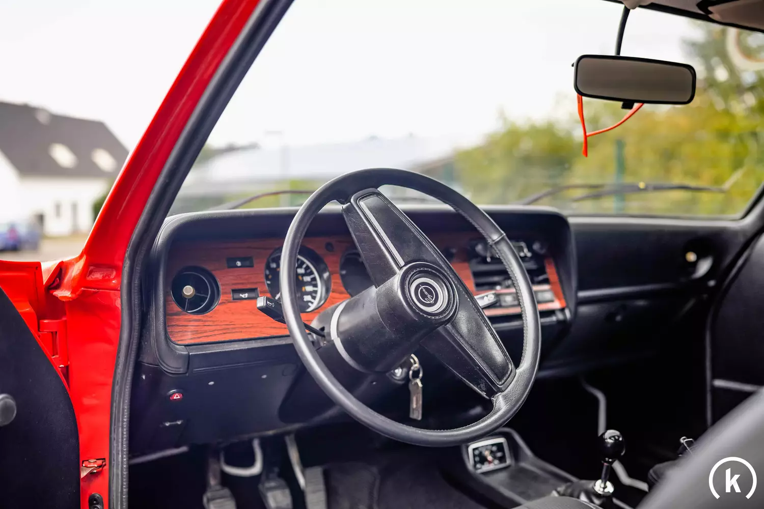 Das Interieur des Ford Capri II GL präsentiert sich überwiegend in einem eleganten schwarz. Der Fußraum ist mit Teppich ausgekleidet, für die Sitzgarnitur und die Innentürverkleidung wurde eine passende Kombination aus Stoff und Kunstleder gewählt. Der gesamte Innenbereich befindet sich in einem sehr gepflegten Zustand, nur an den Sitzen sind leichte Gebrauchsspuren zu erkennen. Das Cockpit und die Mittelkonsole sind im klassischen schwarz gehalten und auf Hochglanz poliert, der Armaturenbereich wird durch eine elegante Holzoptik zusätzlich aufgewertet. Zur Ausstattung gehören neben den klassischen Anzeigen und Bedienelementen ein Radio und eine Uhr, elektrische Fensterheber und Zentralverriegelung sind nicht vorhanden.