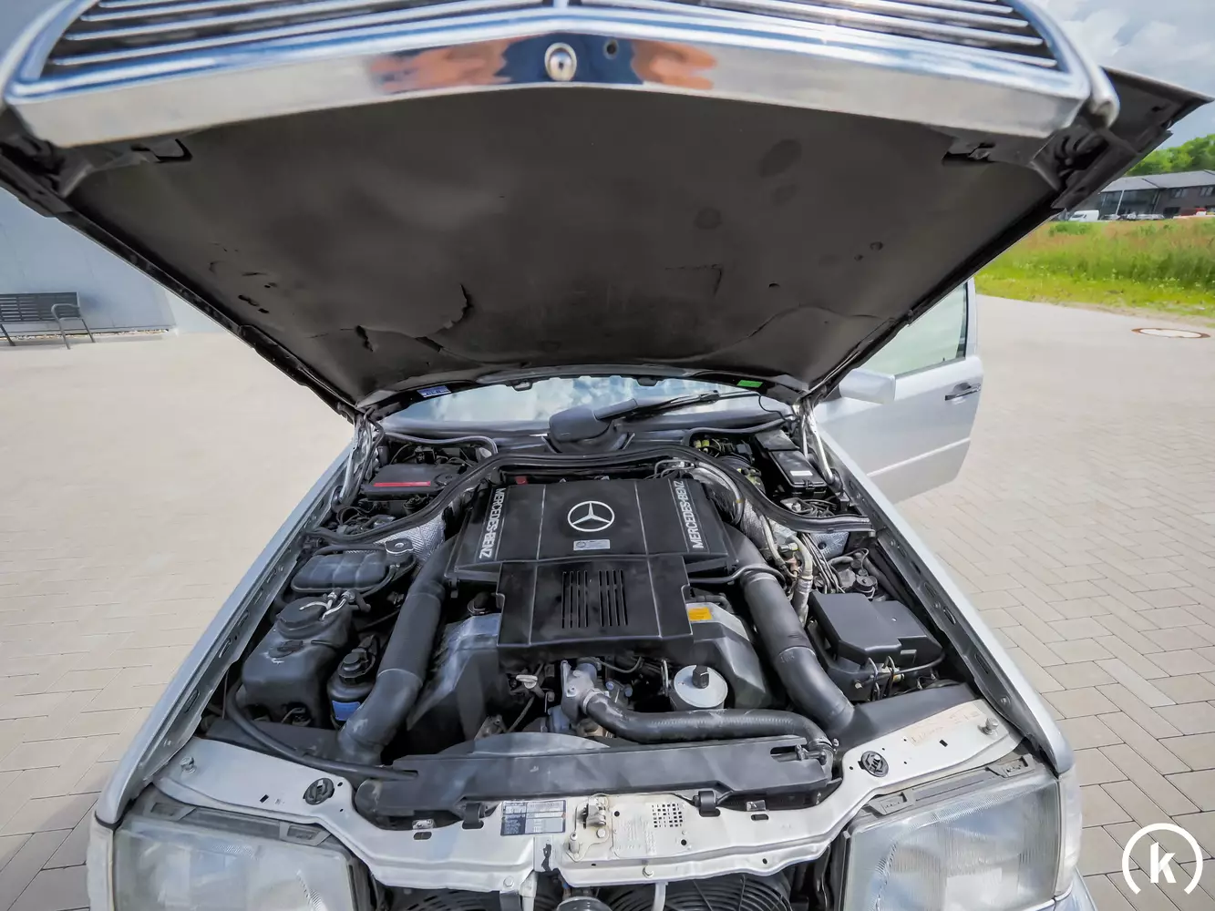 Optisch unaufgeregt und für Nicht-Kenner des E 500 kaum von der normalen W 124 Limousine zu unterscheiden, kommt das Aussehen des V8-Boliden daher. Nur ein Modellschriftzug am Heckdeckel und die Verbreiterung der Vorderkotflügel verraten annähernd die Kraft dieses E 500. Bei diesem Wagen ist zusätzlich eine Sportabgasanlage verbaut, welche den Klang des V8-Motors besser hören lässt. Nachlackierungen im Originalfarbton namens „Brillantsilber-Metallic“ fanden laut Verkäuferaussagen an mehreren Bauteilen und der Stoßstange statt. Als äußerlichen Mangel gibt der momentane Besitzer ein paar Kratzer an den Stoßfängern an, ansonsten präsentiert sich dieser E 500 dem Alter entsprechend in einem guten Zustand. Rost an der gesamten Karosserie kann augenscheinlich keiner vorgefunden werden. Einen Unfall schließt der jetzige Besitzer in seiner Haltedauer aus.