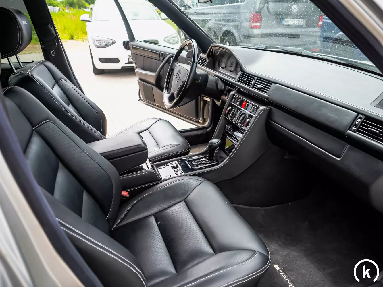 Schwarzes Vogelaugenahorn in Kombination mit schwarzem Vollleder zieren den Innenraum dieses Mercedes-Benz E 500: Im Interieur wurde das Leder individuell bearbeitet: Die schwarzen Vollledersitze mit in Weiß abgesetzten Nähten sind genauso wie die Türtafeln und der Rest des Interieurs in einem einwandfreien Zustand erhalten – auf den Kopfstützen der Vordersitze ist der Schriftzug „AMG“ eingestickt. An Bord dieses E 500 sind unter anderem folgende Ausstattungsmerkmale aufzuzählen: Vordere Sitze elektrisch verstellbar mit Memory, Sitzheizung vorne, Airbag für Beifahrer, Ablagebox in der Ablageschale vorne, elektrisches Schiebedach mit Hubeinrichtung, elektrisches Heckfenster-Rollo, Einbruch- und Diebstahlwarnanlage (EDW), Armlehne klappbar vorn, Feuerlöscher, Heckdeckelzusatzsicherung und ein Radio.