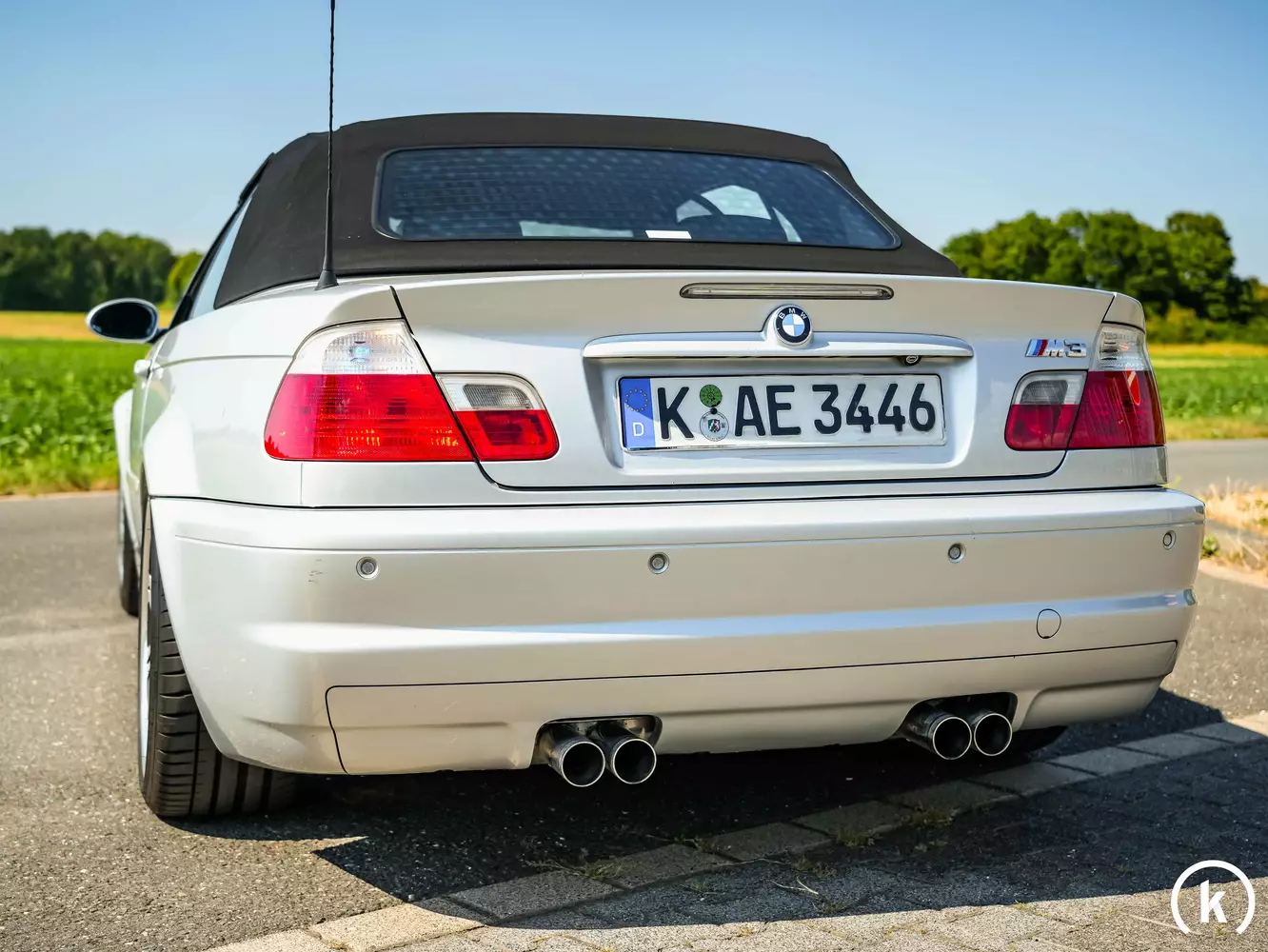 Zwar lässt die silberne Lackfarbe Unauffälligkeit vermuten, doch aufgrund der im Gegensatz zum Serien-E46 um 20 Millimeter verbreiterten Radläufe, der gewölbten Powerdome-Motorhaube, der in den vorderen Kotflügel integrierten Kühlrippen und der großen Frontschürze sorgt dieser M3 für ein auffälliges Aussehen. Am Heck äußert sich der M3 durch die 4 großen Auspuffendrohre. Lacktechnisch fanden Nachlackierungen im Originalfarbton an beiden Kotflügeln statt, einen Unfall schließt der momentane Halter aber aus. Äußerliche Mängel können bis auf normale Gebrauchsspuren keine beanstandet werden, auch Parkrempler an der Frontstoßstange oder dem Heckstoßfänger sind nicht aufzuzählen.