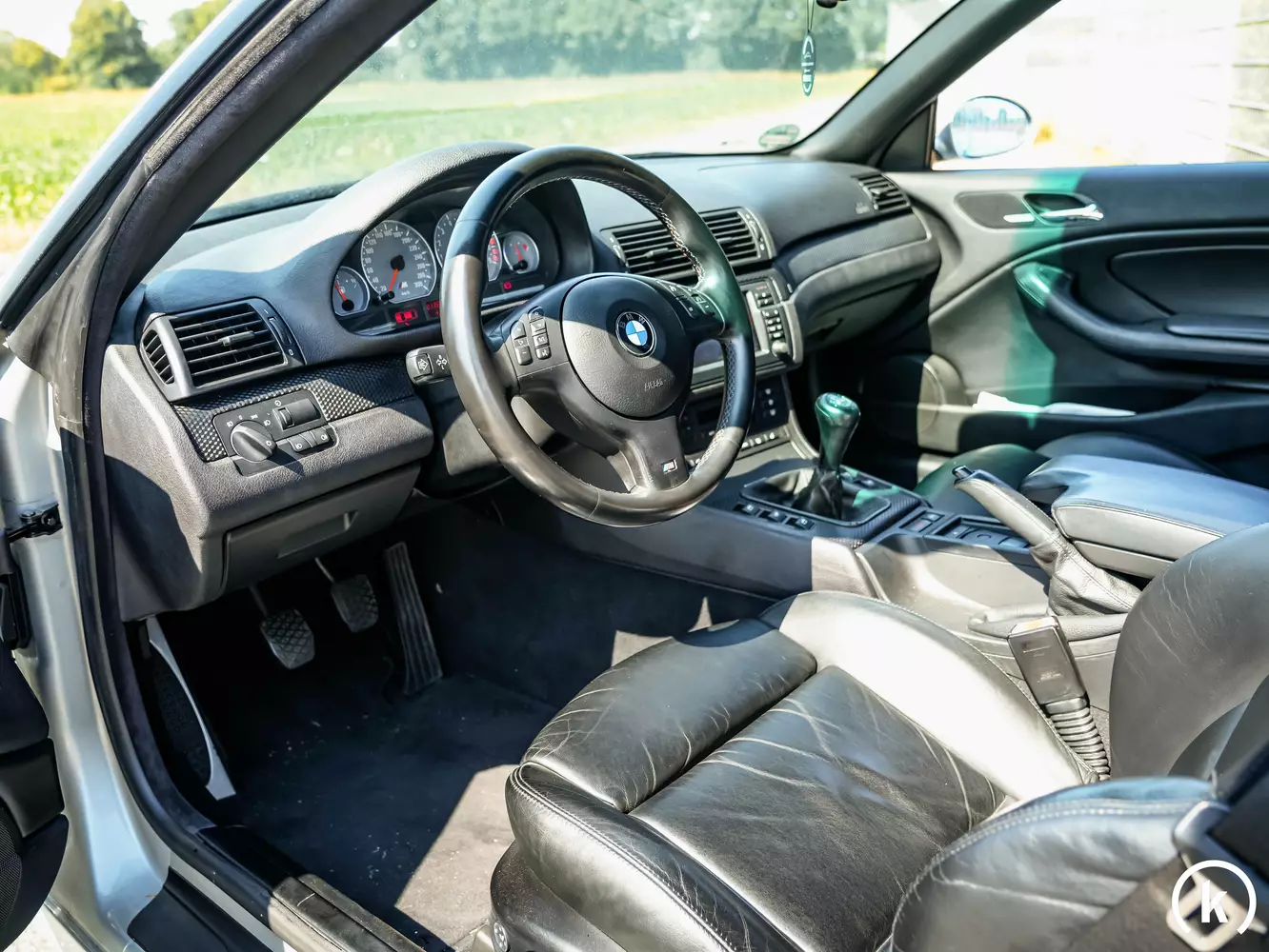 Schwarze Vollleder-Sportsitze sind dem Interieur zu entnehmen: Der Fahrer greift auf ein 3-Speichen Lederlenkrad – welches sich nicht abgenutzt zeigt – und auf einen Lederschaltknauf der sich in guter Verfassung befindet. Allgemein kann dem Innenraum des BMW E46 M3 Cabriolet ein angesichts der Gesamtlaufleistung sehr gepflegter Zustand ohne Defizite attestiert werden. Neben dem Multifunktionslenkrad sind noch folgende Ausstattungsmerkmale an Bord dieses Power-Cabrios: Elektrische Sitzverstellung, Sitzheizung, Fahrersitz mit Memory, elektrische Fensterheber, Zentralverriegelung, Tempomat, Klimaautomatik, ABS und ein Radio mit Display. Alle Ausstattungsoptionen funktionieren tadellos.