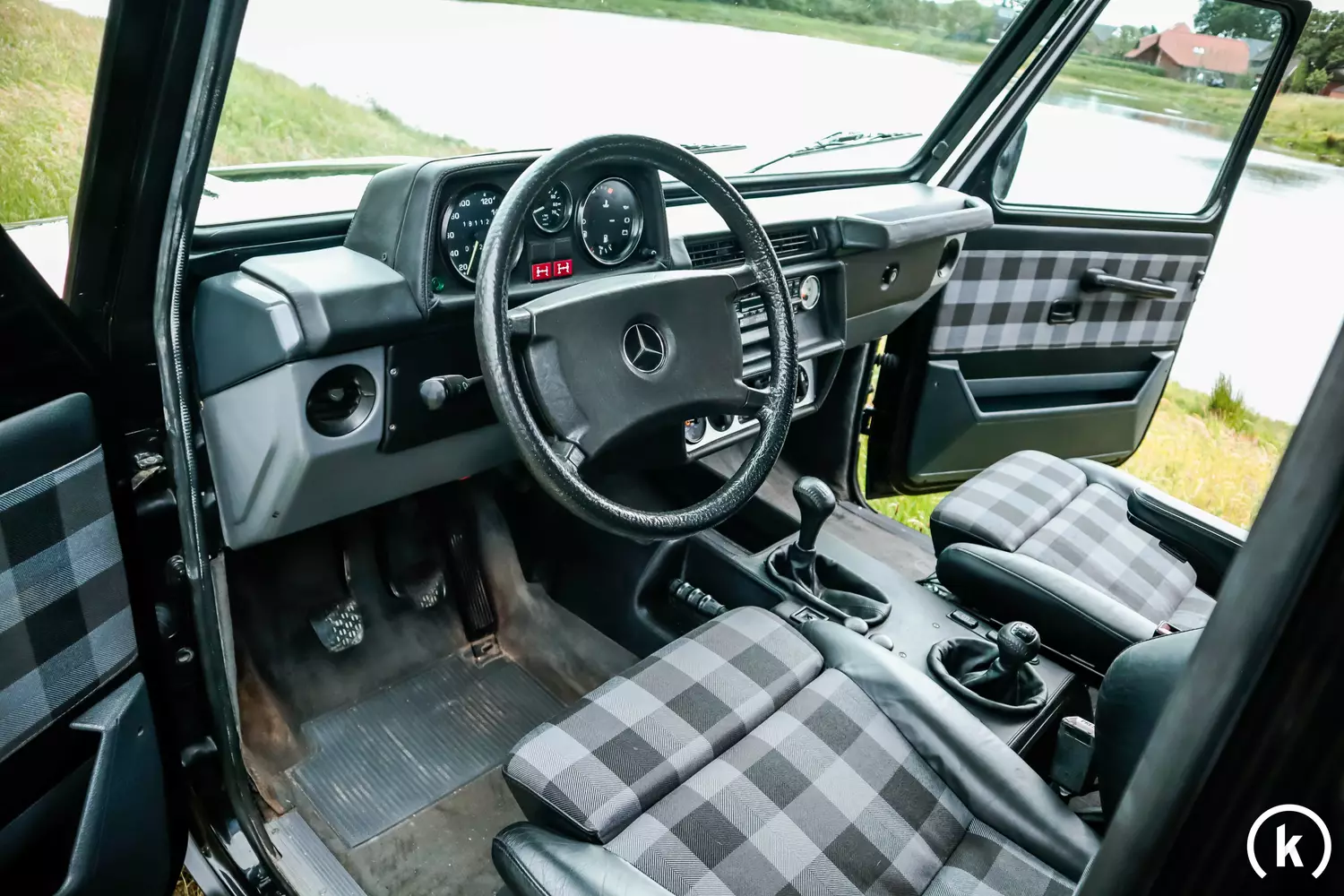 Für knapp 3.200 € sind für das Interieur dieses 250 GD neue Stoffe besorgt worden, zudem kamen Recaro Spezialist M Sitze mit Schenkelauflagenverstellung, Armlehne und Karomuster in die G-Klasse. Der Innenraum dieses Mercedes-Benz erfuhr eine komplette Überarbeitung: Rückbank, Türtafeln, Innenseite der Heckklappe sowie die Sitzbank im Kofferraum wurden allesamt mit dem gleichen Mercedes-Stoff neu bezogen. Mittelkonsole, Armaturenbrett und Innenholme sind komplett mit schwarzem Leder/Kunstleder überzogen worden. Schäden im Innenraum dieses 250 GD sind nicht zu beklagen. Als Ausstattung weist die G-Klasse neben den Teilledersitzen mit Armauflage und mechanischer Lordosenunterstützung unter anderem folgende Merkmale auf: Anhängerkupplung, Differenzialsperre vorne sowie hinten, Zentralverriegelung, elektrische Fensterheber und ein Becker-Mexico Kassettenradio. Im Kofferraum befindet sich noch eine Sitzbank. Insgesamt ist der 250 GD für 7 Personen zugelassen. Sämtliche Anzeigen und Instrumente bis auf die Zusatzanzeige für den Ölkühler (momentan nicht angeschlossen) funktionieren einwandfrei.