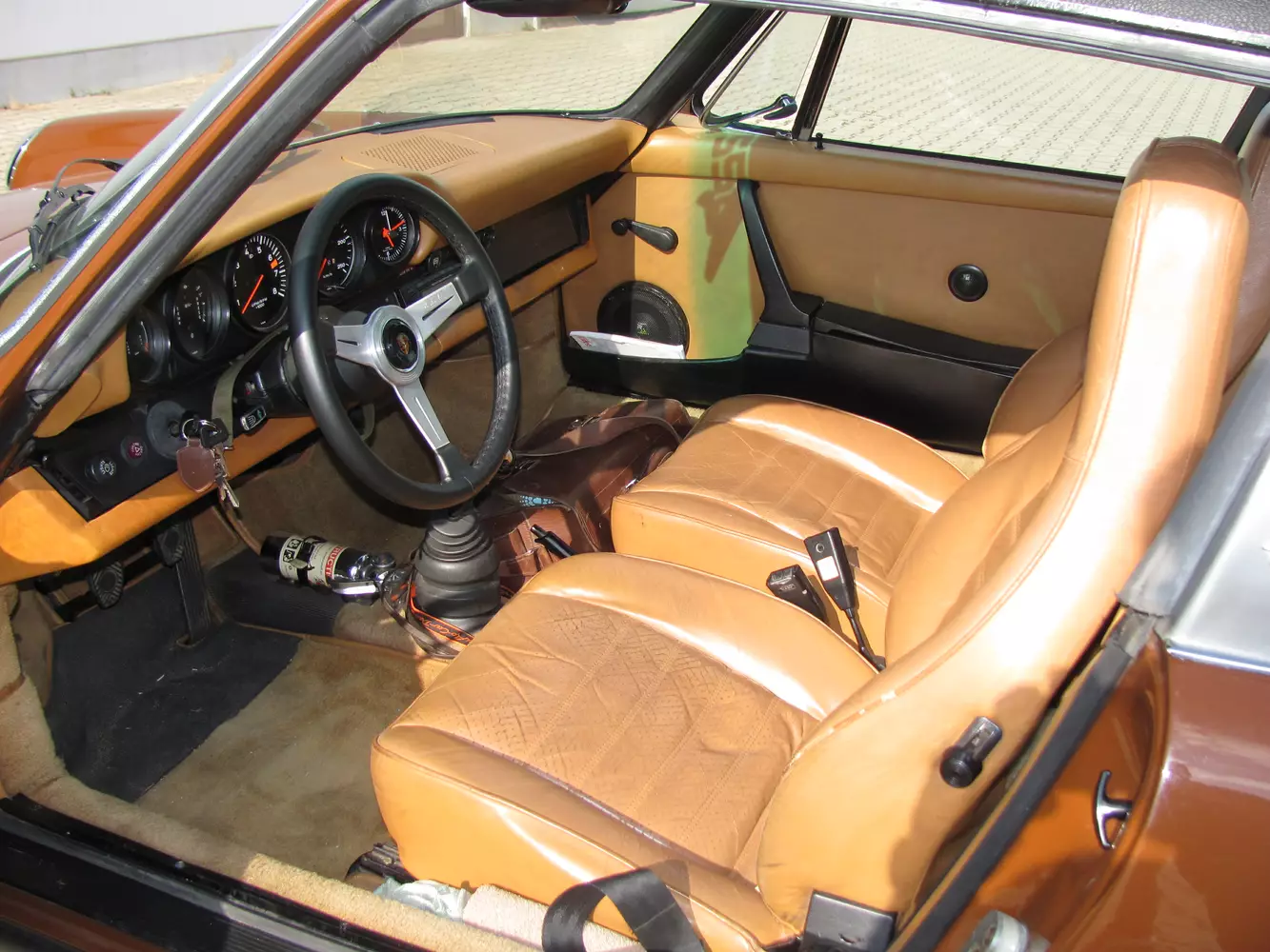 Ein Originales Porsche Lenkrad sitzt vor den fünf Anzeigen, in der Mitte ist der Drehzahlmesser zu finden. Derzeit ist allerdings ein sportlicheres Lenkrad verbaut, das originale liegt aber selbstverständlich bei. Der Tacho zeigt noch die originale Laufleistung an. Da der Motor erneuert wurde beläuft sich die Motorlaufleistung allerdings auf nur ca. 60.000km. Alle Teile sind original und wurden auch nach der Restauration erhalten, um den Zustand nicht zu verändern. Der Tacho wurde mittlerweile auf einen Deutschen Tacho umgerüstet und befindet sich in einem fantastischen Zustand. Die Laufleistung beträgt insgesamt laut Aussage des Besitzers wahrscheinlich 170.000Km und seit der Revision ca. 60.000Km.