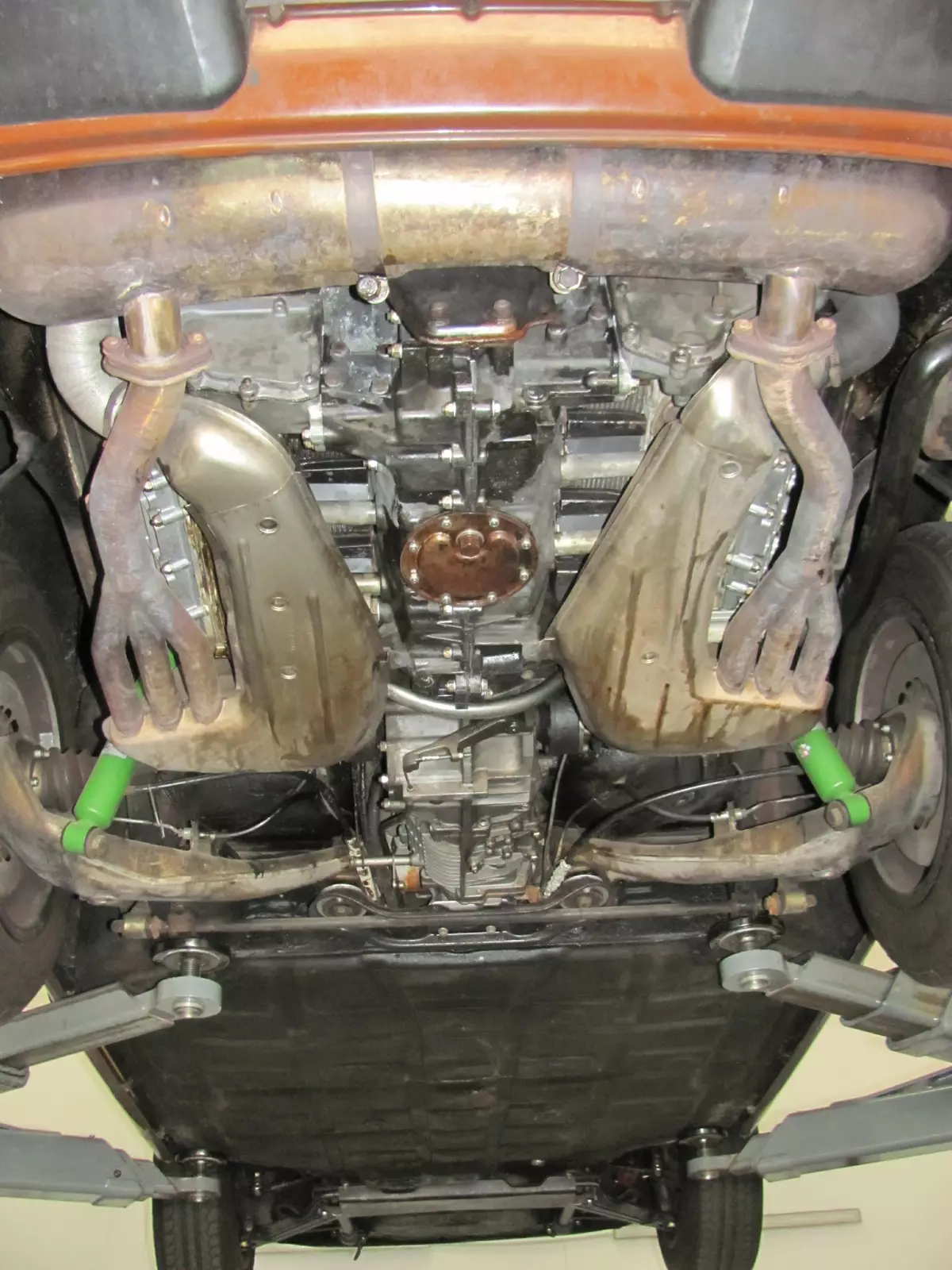 Die Abgasanlage wurde ebenfalls erneuert, wie auf dem Bild zu erkennen ist. Ansonsten hat der Unterboden keinerlei Schwächen oder Rost und ist in einem guten Zustand. Die Lackierung wurde fachmännisch durchgeführt und lässt den Porsche wieder in seinem ursprünglichen Glanz erscheinen.
