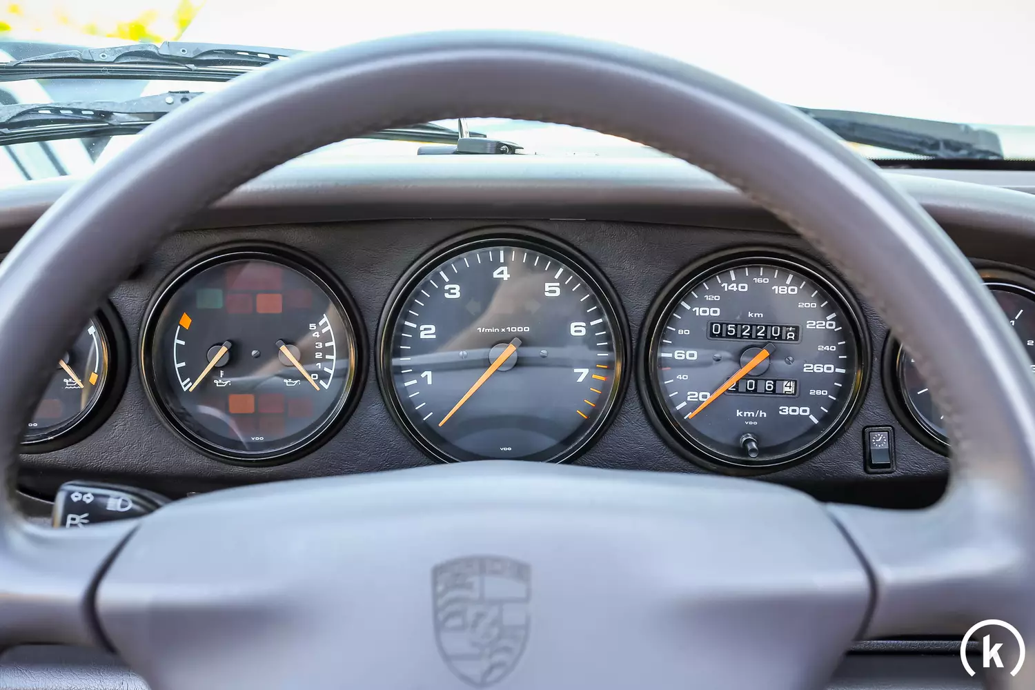 Auch im 993 ist die Instrumententafel in klassischer Porsche-Manier gehalten, in der fünf Rundinstrumente die relevanten Informationen darstellen. Anhand des Tachometers, welcher sich rechts neben dem mittig angebrachten Drehzahlmesser befindet, lässt sich eine Laufleistung von 52.208 mi ablesen. Das originale MPH-Tachometer wurde bei der Umrüstung auf die EU-Norm gegen ein deutsches KM/H Tachometer ausgetauscht. Das Zählwerk läuft trotz KM Tacho noch auf Meilen, somit ist der Wagen knapp 84.042 km gelaufen. Dieser Kilometerstand ist durch beiliegende Rechnungen, TüV-Berichte und Scheckhefteintragungen nachvollziehbar. Die Instrumente funktionieren den Angaben nach mängelfrei.