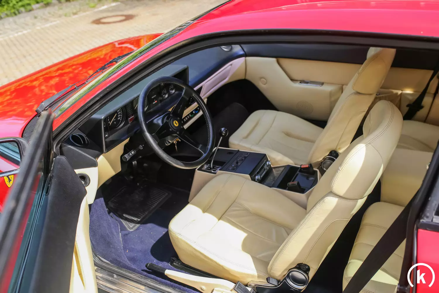 Beiges Leder ist dem Interieur dieses Ferrari zu entnehmen: Teile des Armaturenbretts, der Türtafeln und der Mittelkonsole sind in schwarz gehalten. Schäden im Innenraum dieses Mondial können nicht verzeichnet werden. Laut Angaben des Verkäufers weist dieser Wagen nahezu Vollausstattung auf: Neben den Vollledersitzen und dem 3-Speichen Lederlenkrad sind zudem Servolenkung, Zentralverriegelung, elektrische Fensterheber, Klimaanlage, ABS und ein zeitgenössisches Radio aufzuzählen. Allen Anzeigen, Instrumenten, Schaltern und Hebeln im Innenraum kann eine einwandfreie Funktion zugesprochen werden.