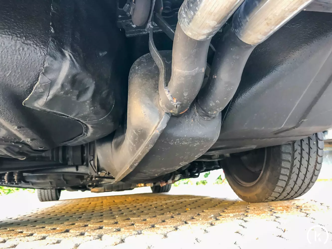 Mit Unterbodenschutz versiegelt präsentiert sich die augenscheinlich sauber erhaltene Unterseite des BMW 635 CSi. Dieser E24 ist sowohl für längere Reisen als auch für kurze Strecken gleichermaßen geeignet: Luxus und Sport gehen hier eine ideale Liaison ein. Wer diese Eigenschaften gemeinsam mit einer markanten Fahrzeugsilhouette sucht, hat mit dem E24 das richtige Automobil gefunden.