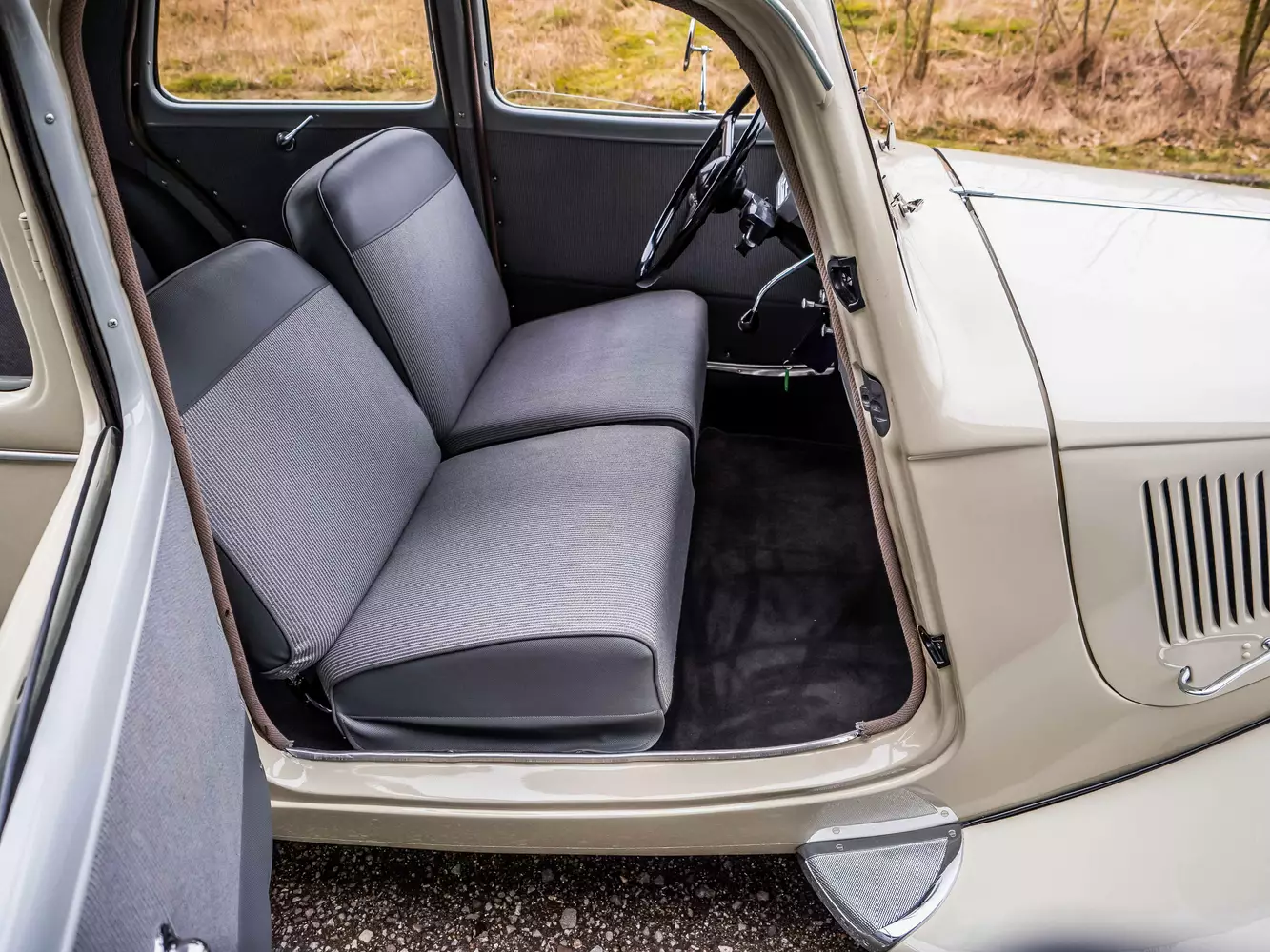 Öffnet man die vorderen Selbstmördertüren, so erblickt man neu gepolsterte sowie neu bezogene Sitze vorne und im Fond, ein neues Armaturenbrett und einen im Gesamten sehr guten Innenraumzustand. Schäden im Interieur des Citroën können keine festgestellt werden, selbst der Dachhimmel oder der Fußraumteppich befinden sich in einer hervorragenden Verfassung. Den Bedienelementen im Innenraum kann eine volle Funktion attestiert werden. Ausstattungsmäßig ist wirklich nur das nötigste an Bord, hier heißt es noch: „Autofahren in seiner reinsten Form.“. Französisches Flair und der Gedanke an verschiedenen Verfolgungsjagden mit dem „Gangster-Citroën“ in diversen Krimis kommen in diesem Fahrzeug ganz von selbst.