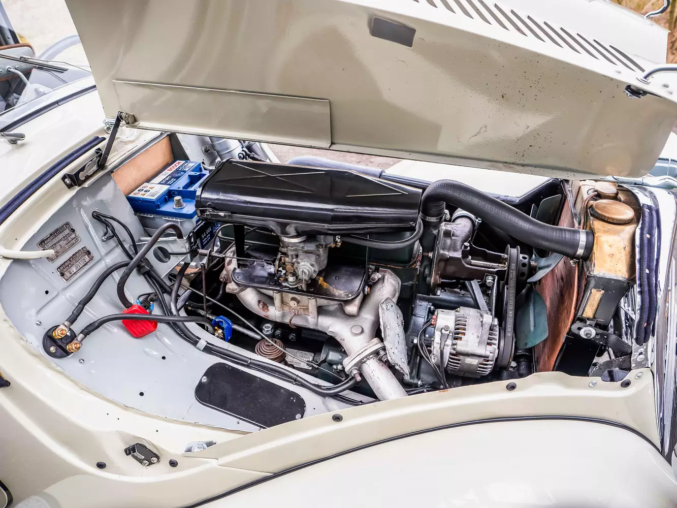 Einer Überarbeitung wurde auch der Reihenvierzylindermotor mit einem Hubraum von 1,9-Litern und 56 leistenden PS unterzogen. Laut Verkäuferangaben zählte zur Revision unter anderem die Überarbeitung der Pleuel und des Zylinderkopfes. Der Motorraum präsentiert sich überaus sauber. Die 3-Gang Handschaltung lässt sich gut bedienen, Schäden im Antriebsstrang sind nicht festzustellen.