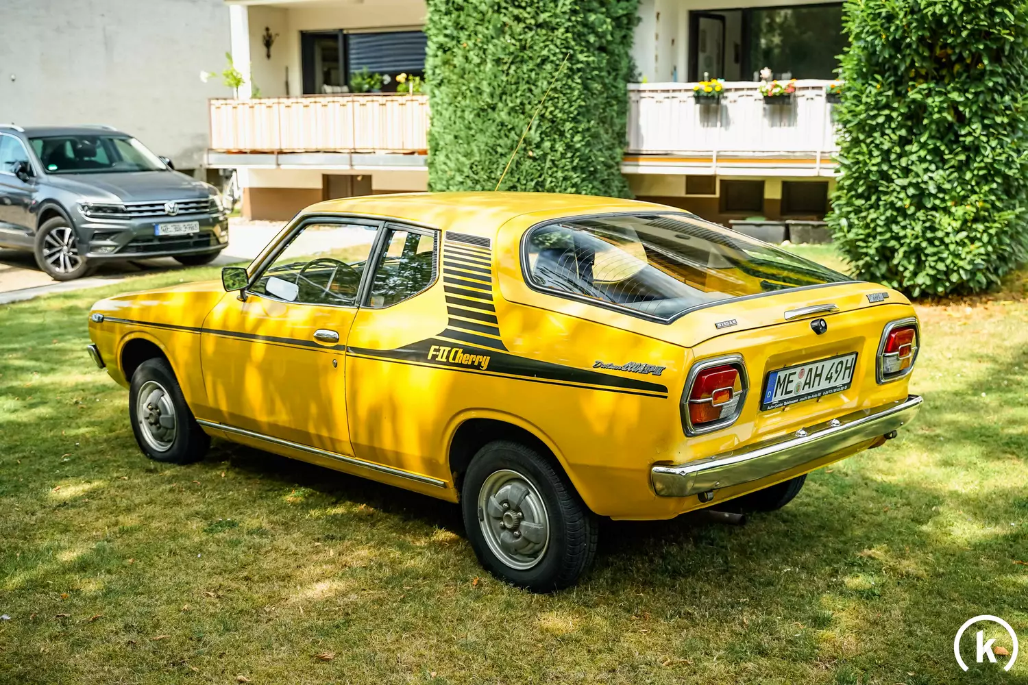 Der in gelb lackierte Japaner steht insgesamt sehr solide dar und wurde laut Besitzer an der linken Seite und der Motorhaube nachlackiert. Das schwarze Dekor, welches sich eigentlich einmal rund um den Wagen zieht, verleiht dem Cherry einen sportlichen Look, der dem Kleinwagen äußerst gut steht. Das Dekor ist äußerst selten und befindet sich immer noch in einem guten, dem Alter entsprechenden Zustand. Der Cherry ist kein Museumsstück, so dass der Lack ein paar Mängel aufweist, die aber eher kosmetischer Natur sind. Alles Genauere entnehmen Sie bitte den Bildern. Er braucht wieder ein bisschen Liebe, stellt aber eine sehr gute Substanz dar.