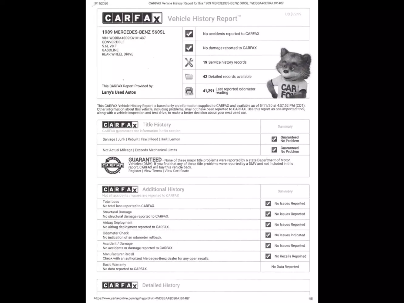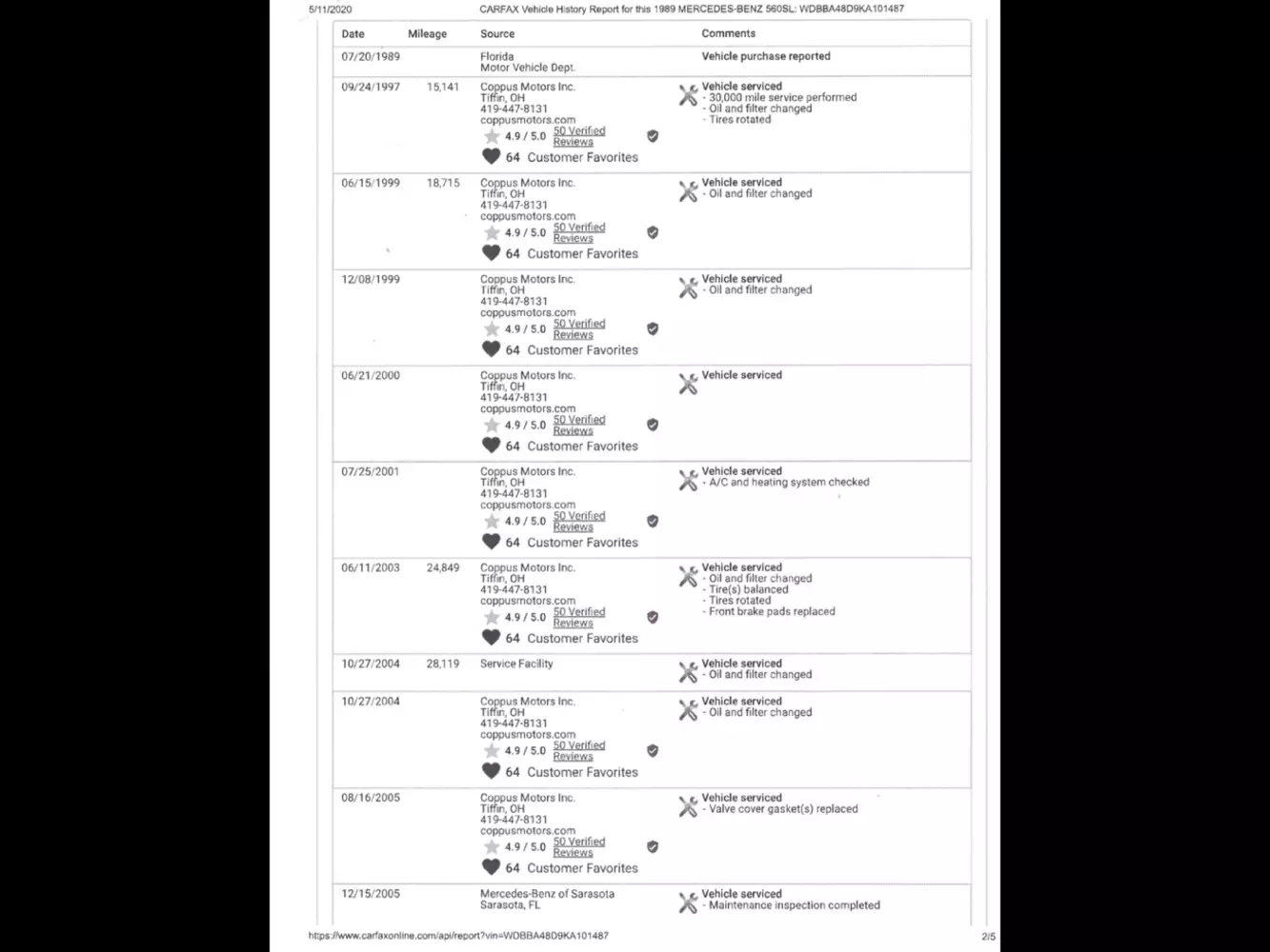 Der letzte Carfax-Eintrag ist vom 22.10.2019. Insgesamt sind 42 Einträge seit 20.7.1989 vorhanden. Davon 19 Serviceeinträge und 16 mit Meilenangabe. Das Carfax weist keinen Unfall aus und ich selbst hatte auch keinen zu Fall mit dem Wagen. Ich versuche das gesamte Carfax noch einstellen zu lassen.
