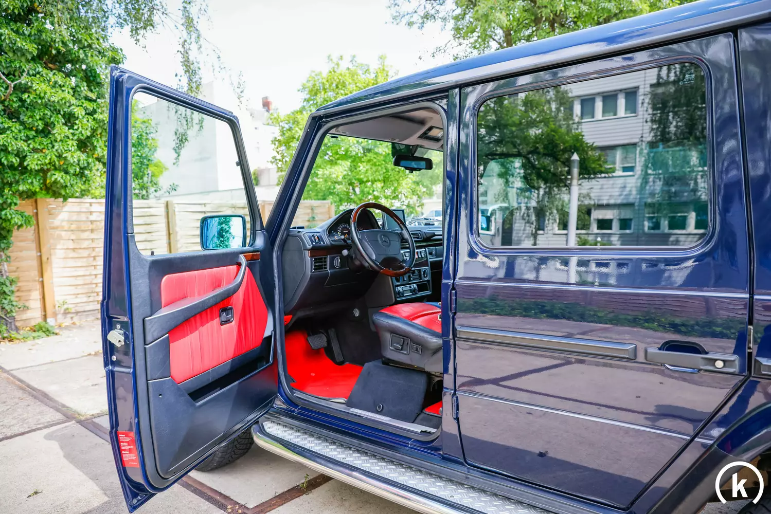 Auffallend gibt sich das in rot/schwarz gehaltene Leder im Interieur dieses Brabus 5.8: Die zweifarbige Lederausstattung wurde den Verkäuferaussagen zufolge den damaligen Brabus Farben entsprechend in rot/schwarz modifiziert. Insgesamt kann der Innenausstattung des G-Modells ein gutes Befinden attestiert werden. Überaus reichhaltig präsentiert sich die Ausstattung des Brabus-Mercedes gehalten – Unter anderem befinden sich folgende Merkmale an Bord des G 500 5.8: Sitzheizung vorne u. hinten, Mittelarmlehne vorne, elektrische Sitze mit Lordosenstütze, zusätzliche Sitzbänke hinten, elektrisches Schiebedach, Anhängerkupplung, getönte Scheiben ab B-Säule, Außenspiegel beheizbar, Tempomat, Klimaanlage, elektrische Fensterheber vorne u. hinten, Leder-/Holzlenkrad, rote Fußmatten, Wurzelnuss Holzeinlagen und ein originaler MB Audio 10 Radio. Des Weiteren befindet sich am Armaturenbrett noch ein separates Navigations-Display an Bord. Sämtliche Ausstattungselemente sind laut Verkäuferaussagen voll funktionsfähig.